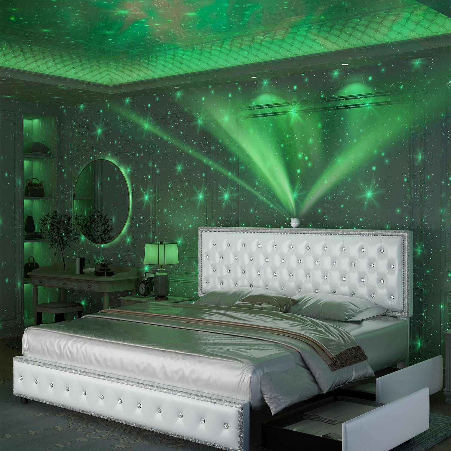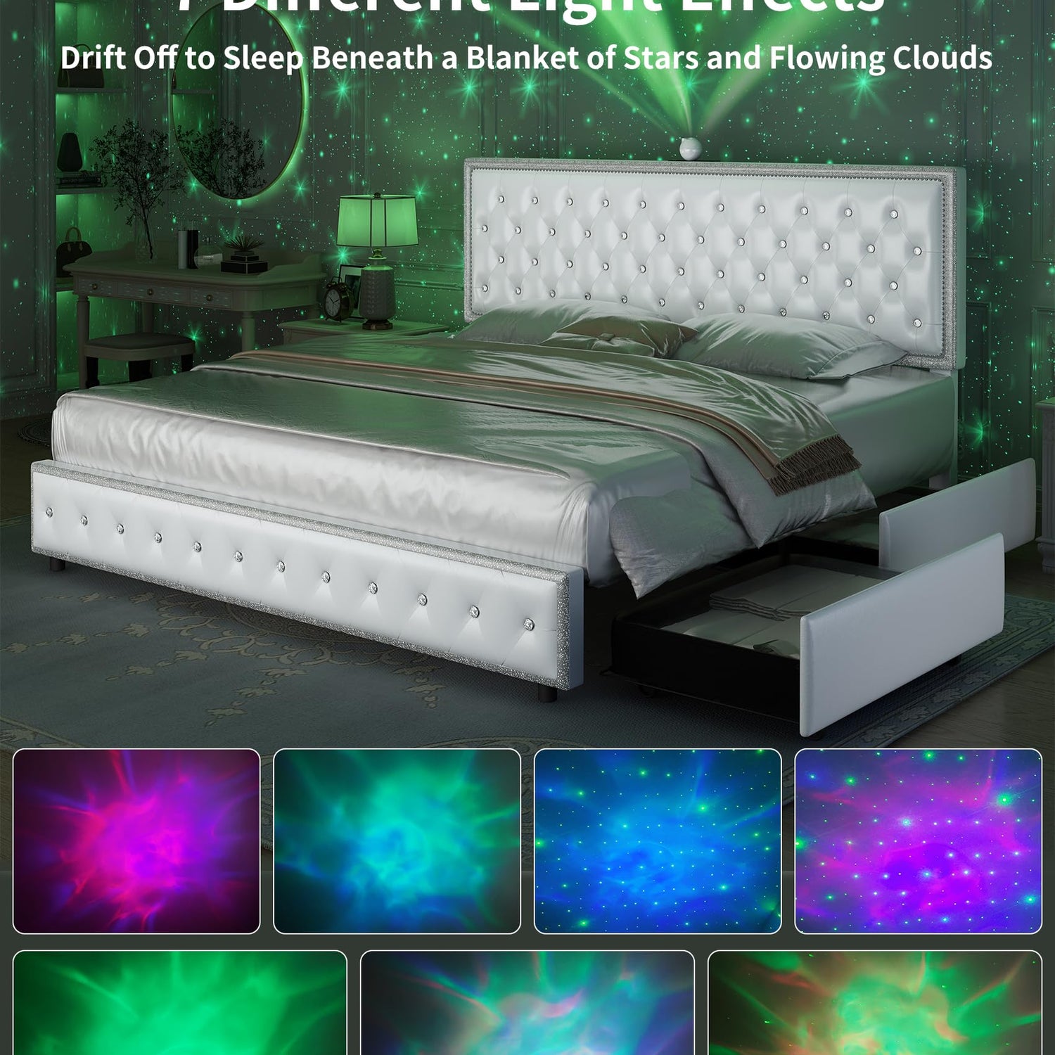 GEGOFORU Queen led Bed Frame with 4 Drawers,Galaxy Projector Adjustable Upholstered Headboard Diamond Bed Frame with Charger Music Speaker, No Box Spring Needed, Wooden Slats Support, PU White