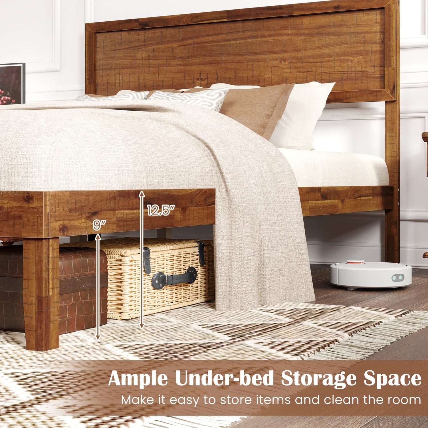 Featuring retro walnut headboard, this bed frame seamlessly blends with various bedroom interiors while ensuring cozy back support. Crafted from high-quality acacia wood, known for its durability and pleasing grain texture, the bed frame boasts sturdy support and long-lasting use. It incorporates strong plywood slat system and middle support legs which evenly distribute weight. Besides, the ample under-bed storage space makes it easy to store items and clean the room. All in all, the platform bed exudes charm and character, adding a touch of nostalgia to any room.