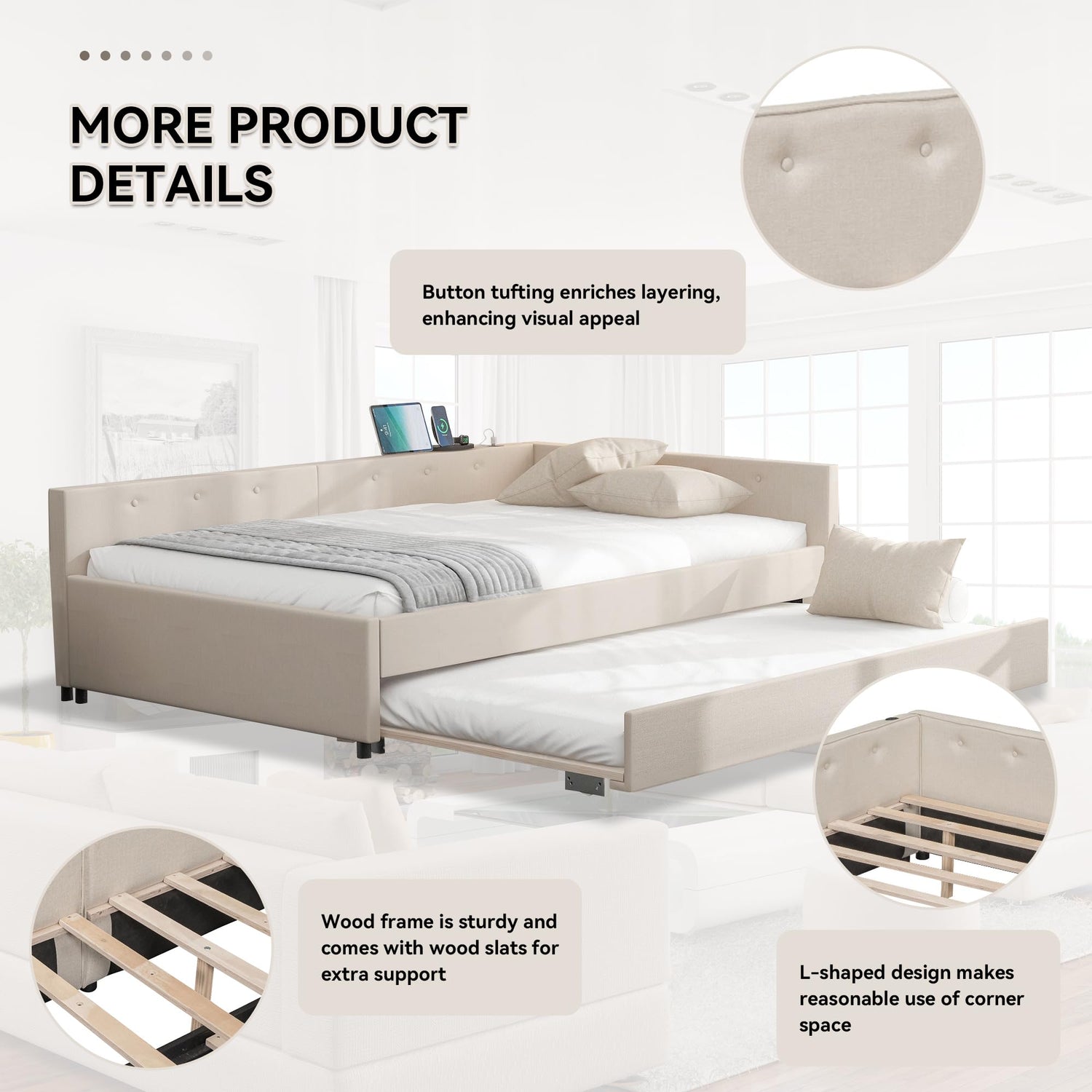 - 【Twin Size Trundle】 This versatile L shaped day bed frame includes a space-saving trundle that slides easily out, providing extra sleeping capacity. Ideal for hosting guests or accommodating family members in small or multi-functional rooms