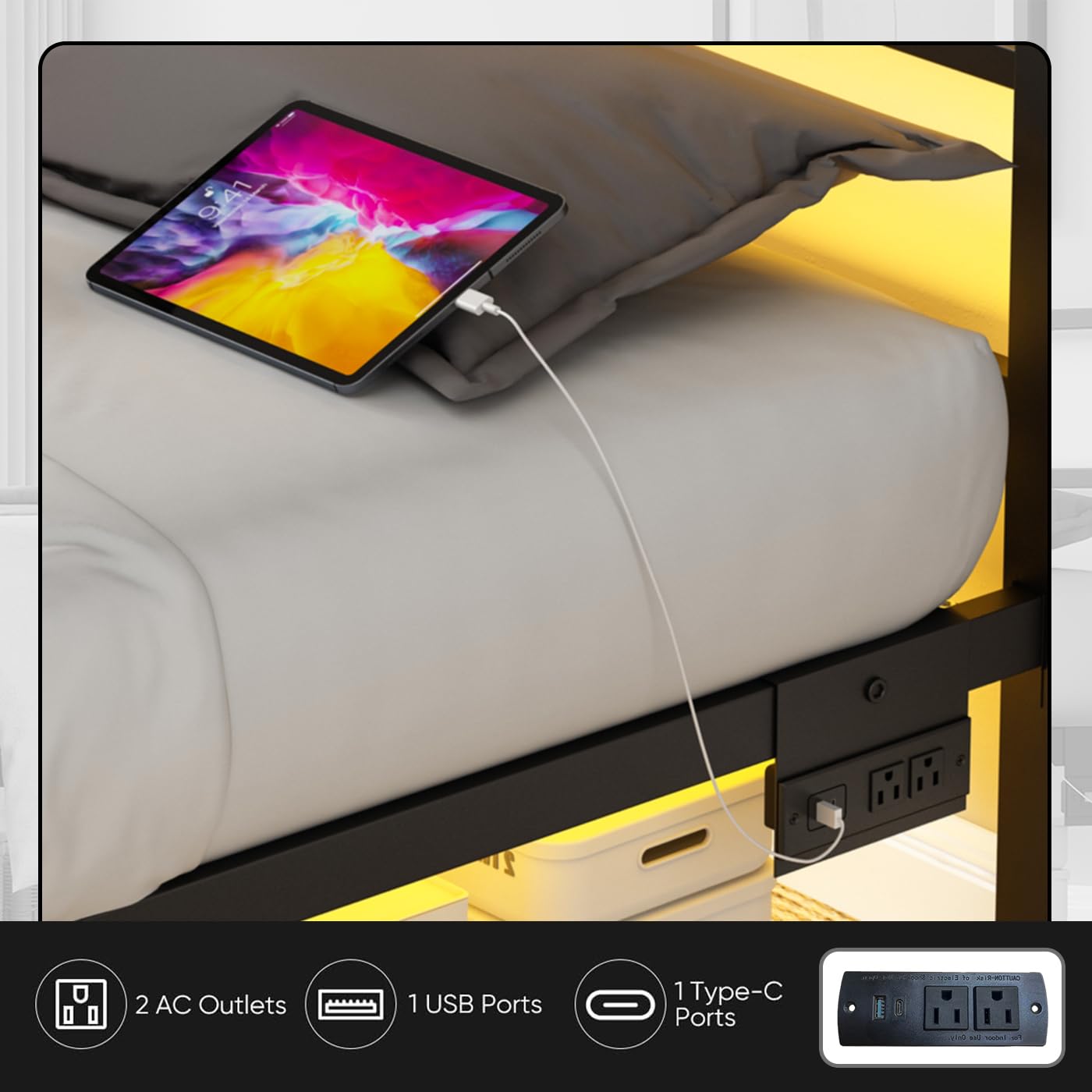 • Full Size Bed Frame with Charging Station:This black full size bed frame has 2 built-in standard power outlets and 2 USB ports to fully charge your electronic devices at the same time.You can easily charge your devices without leaving the comfort of your bed.Say goodbye to the trouble of insufficient sockets!