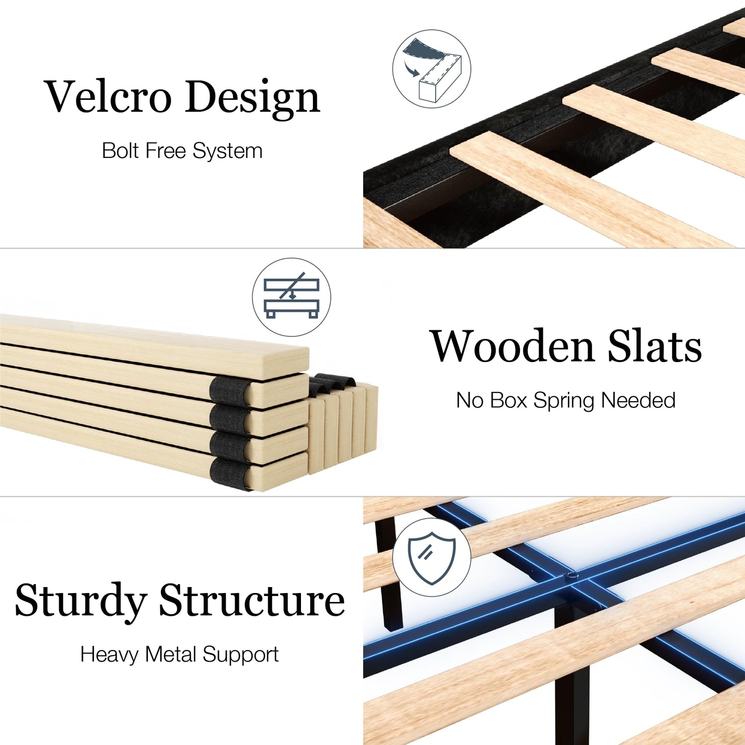 - NOISE-FREE DESIGN: This queen bed frame with headboard comes with Velcro-equipped slats simplify assembly and minimize noise. Enjoy every silent second for a good night's sleep on the perfect noise-free bed
