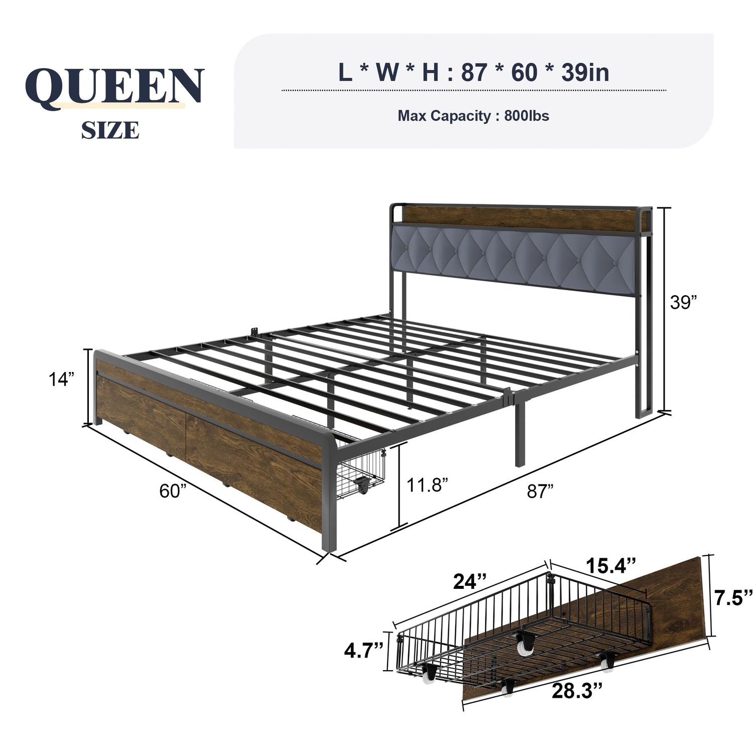 HAOARA Queen Size Metal Platform Bed Frame with 2 Storage Drawers & LED Light, Velvet Button-Tufted Headboard with Outlet & USB Charging Port, Heavy Duty, Brown Wooden Panel, No Box Spring Needed