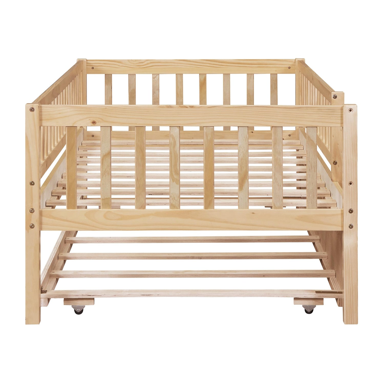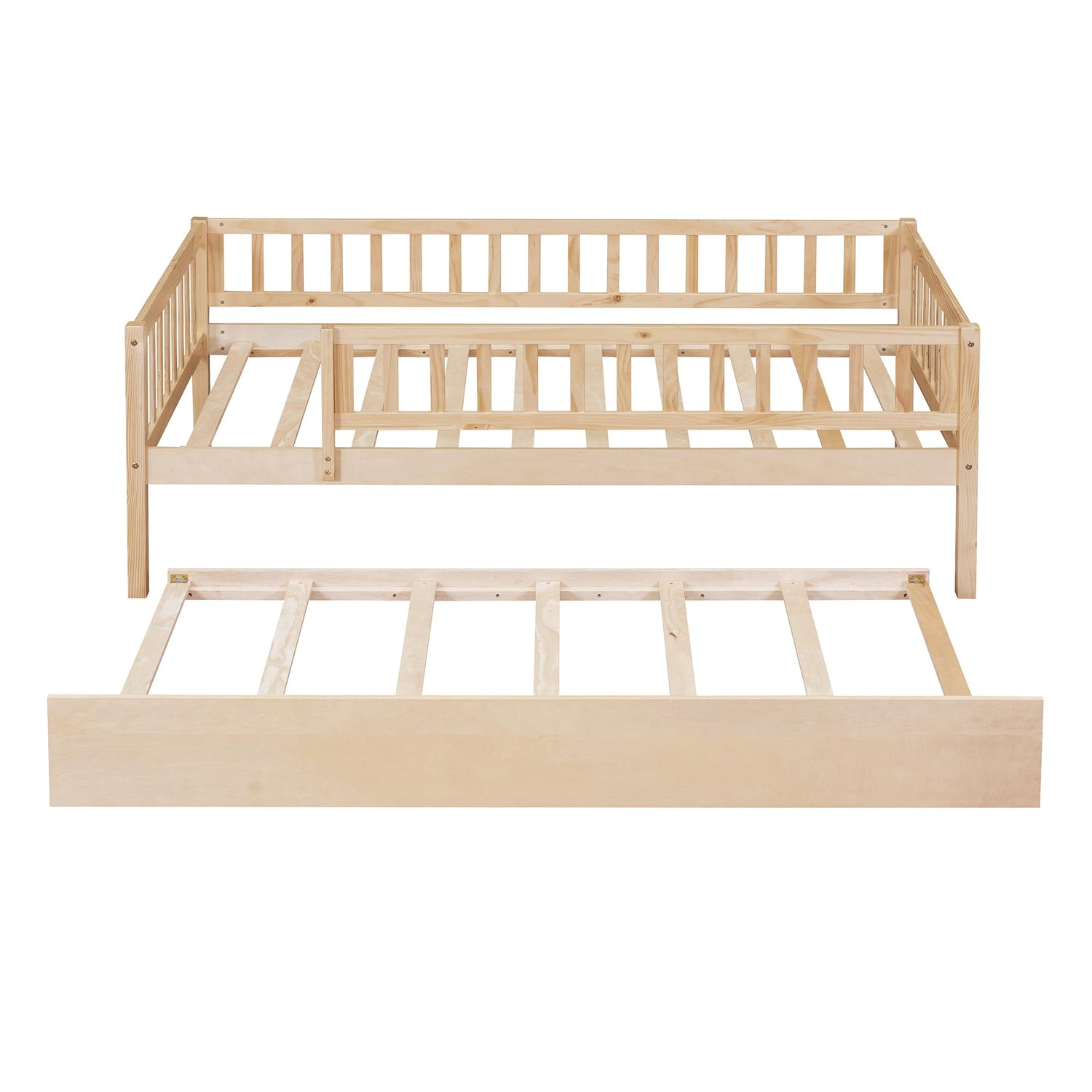 Harper & Bright Designs Twin Daybed with Trundle, Wood Twin Trundle Bed Frame with Fence Rails,Montessori Twin Bed for Kids Girls Boys Bedroom,Guest Room,Living Room,No Box Spring Needed,Natural