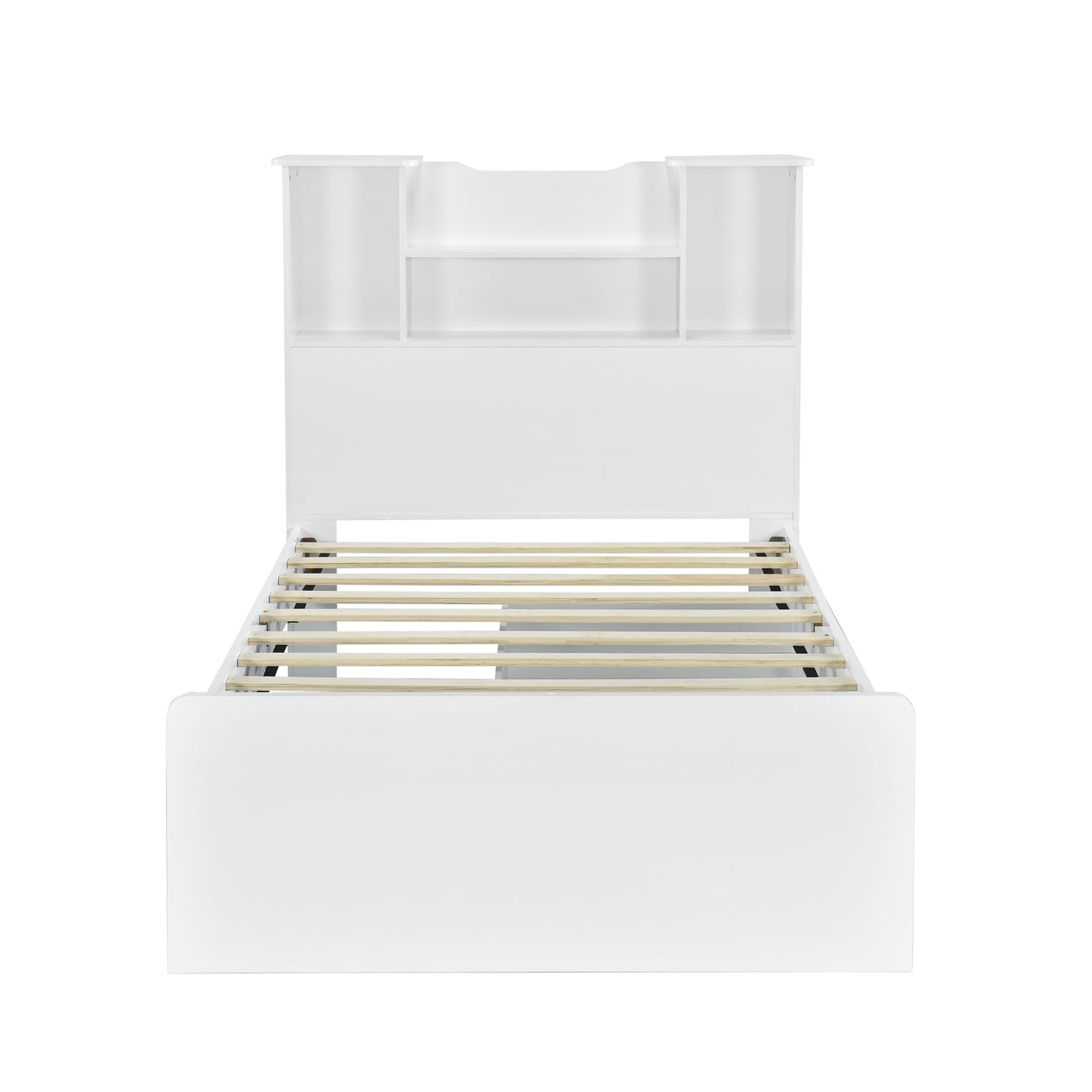 Details: Twin Size Storage Platform Bed Frame with 4 Open Storage Shelves and 2 Storage Drawers,White