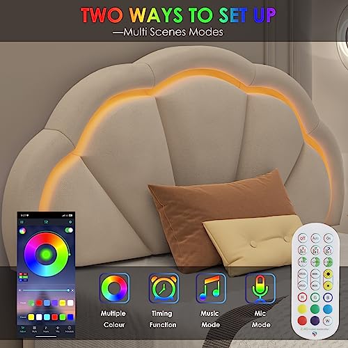 HIFIT Twin Upholstered LED Bed Frame with Adjustable Petal Headboard in Beige - Soft Velvet Princess Platform Bed for Kids