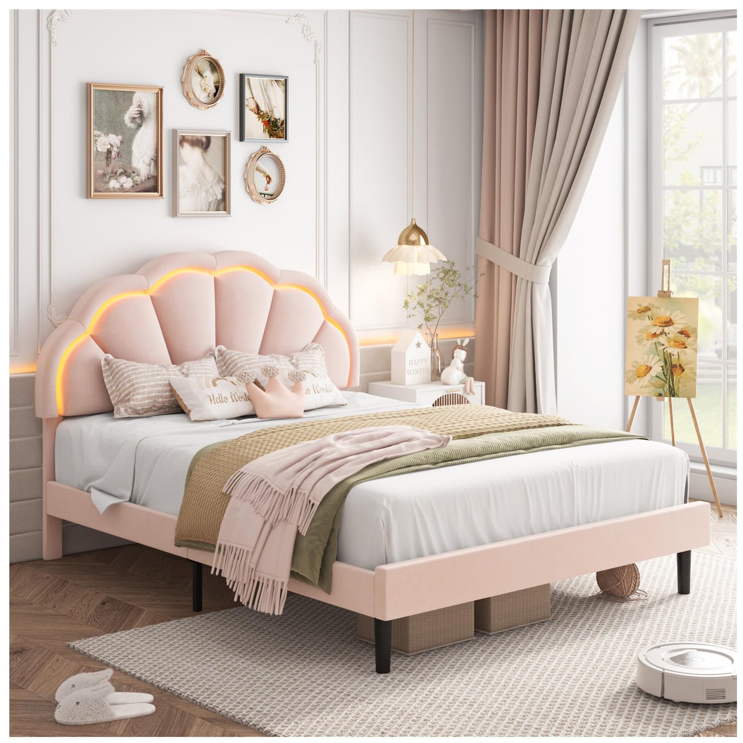 HIFIT Full Upholstered Smart LED Bed Frame with Adjustable Chic Petal Headboard, Princess Full Size Platform Bed Frames for Kids/Girls, Wooden Slats Support, No Box Spring Needed, Easy Assembly, Pink
