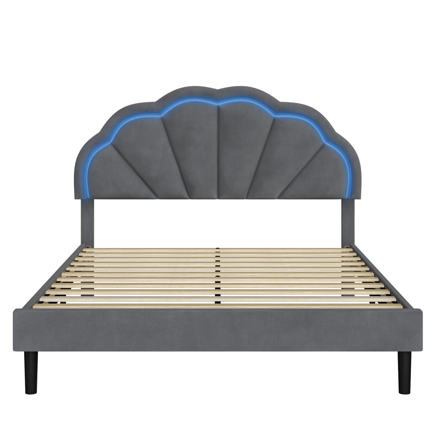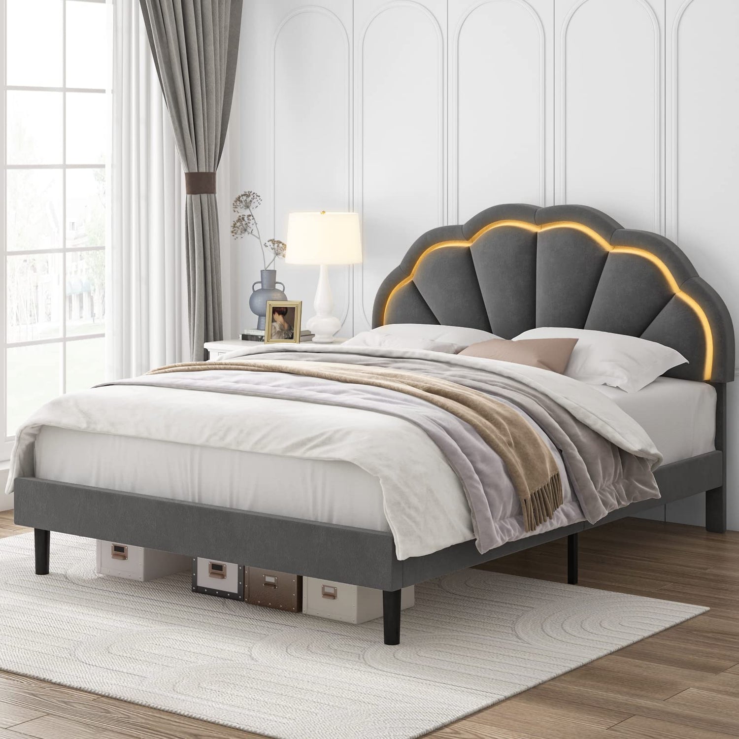 HIFIT Queen Smart LED Upholstered Bed Frame with Adjustable Floral Headboard, Grey