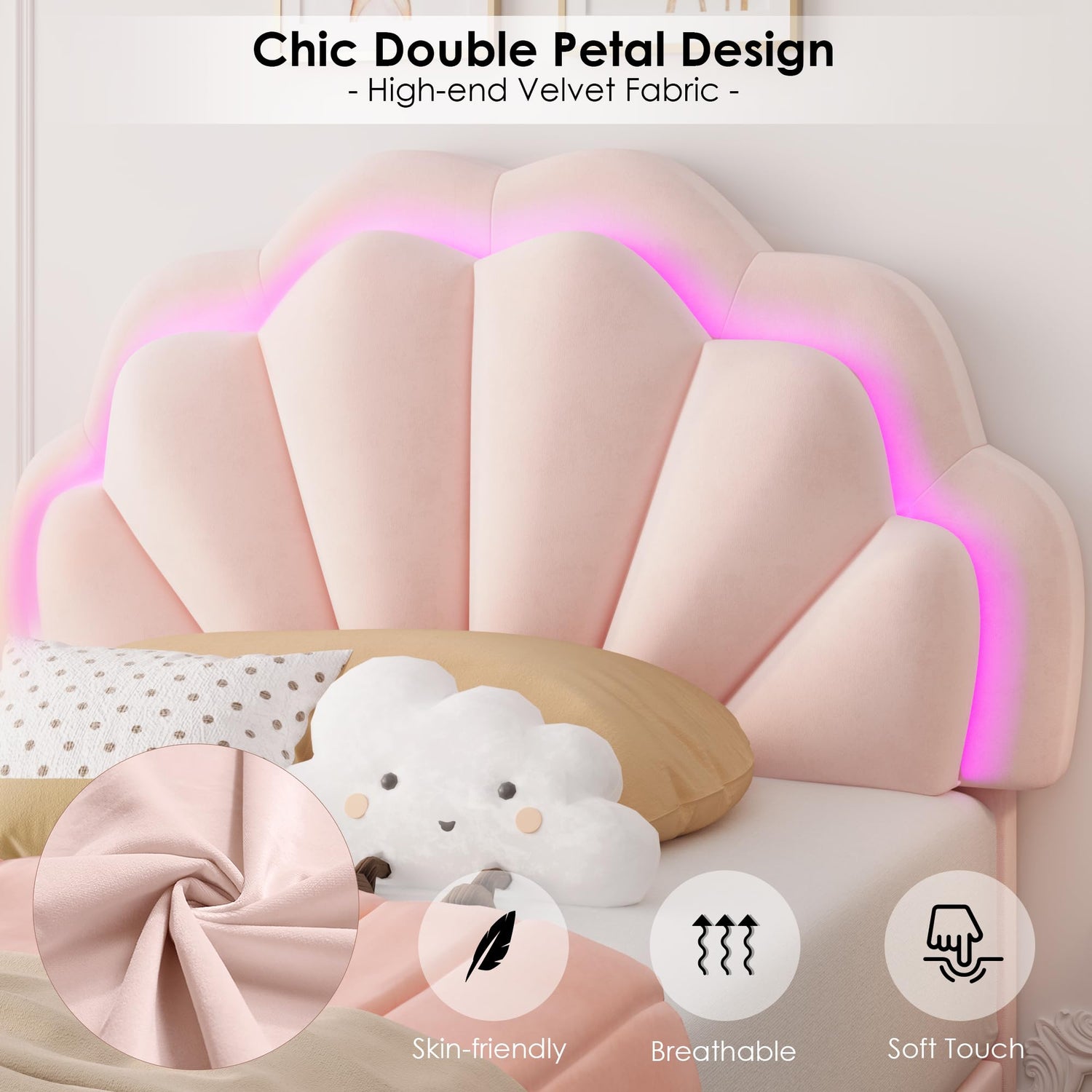 HIFIT Twin Upholstered Smart LED Bed Frame with Storage Drawer and Adjustable Chic Double Petal Headboard, Princess Platform Bed for Girls/Kids, Solid Wood Slats Support, No Box Spring Needed, Pink