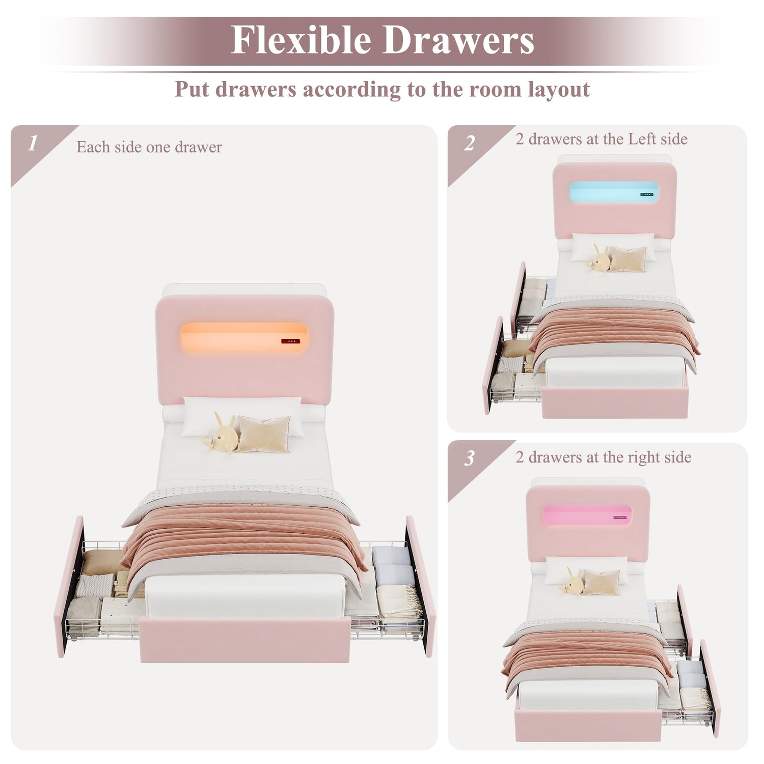 HOSTACK Twin LED Bed Frame with Storage Headboard and Charging Station, Girls Bed Frame with 2 Drawers and USB Ports, Velvet Upholstered Platform Bed Frame with Bookcase, No Box Spring Needed, Pink