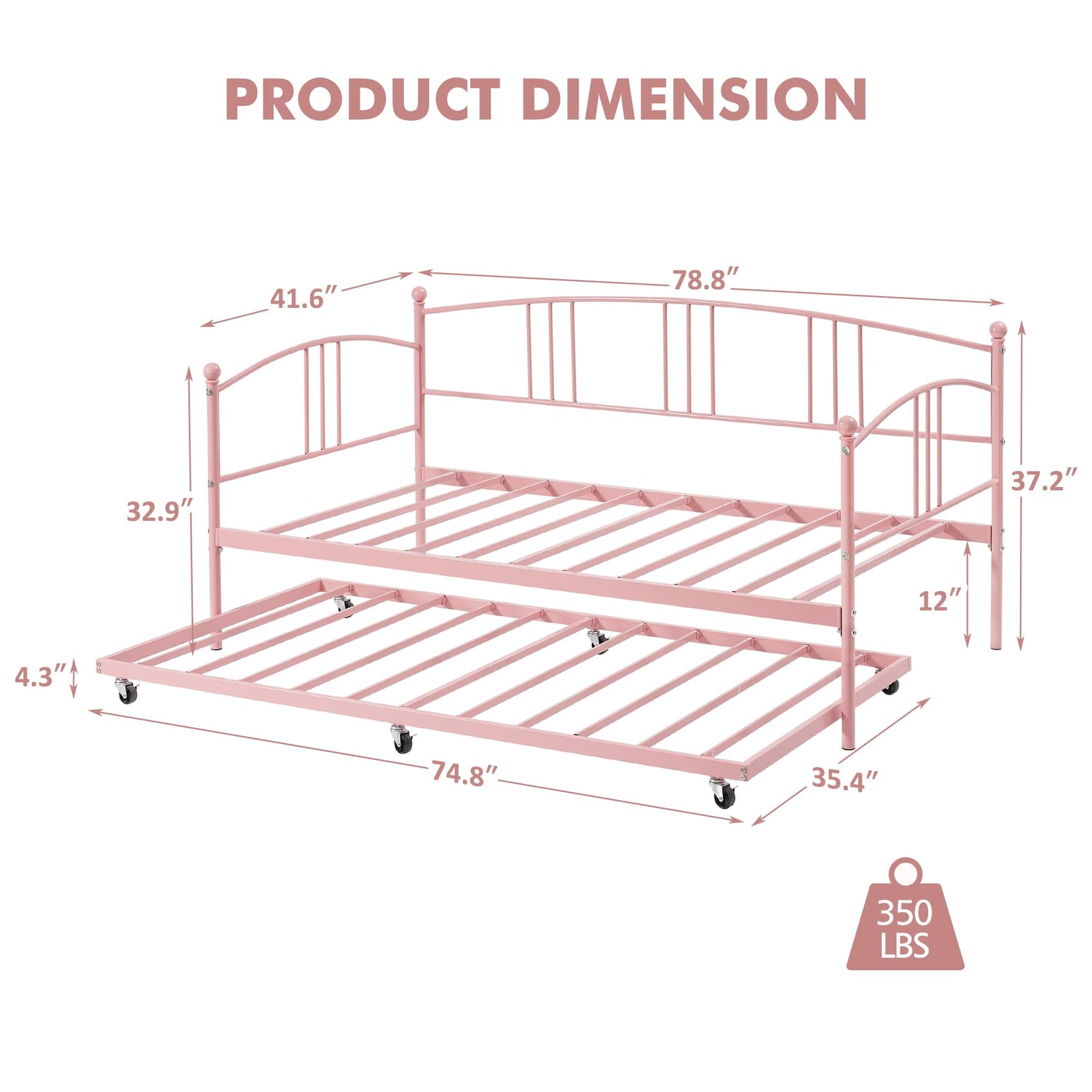 IDEALHOUSE Twin Daybed with Trundle, Metal Twin Size Daybed with Pullout Trundle 6 Casters, Steel Slat Support Sofa Bed for Living Room, Bedroom, Guest Room (Black/White/Pink/Purple)