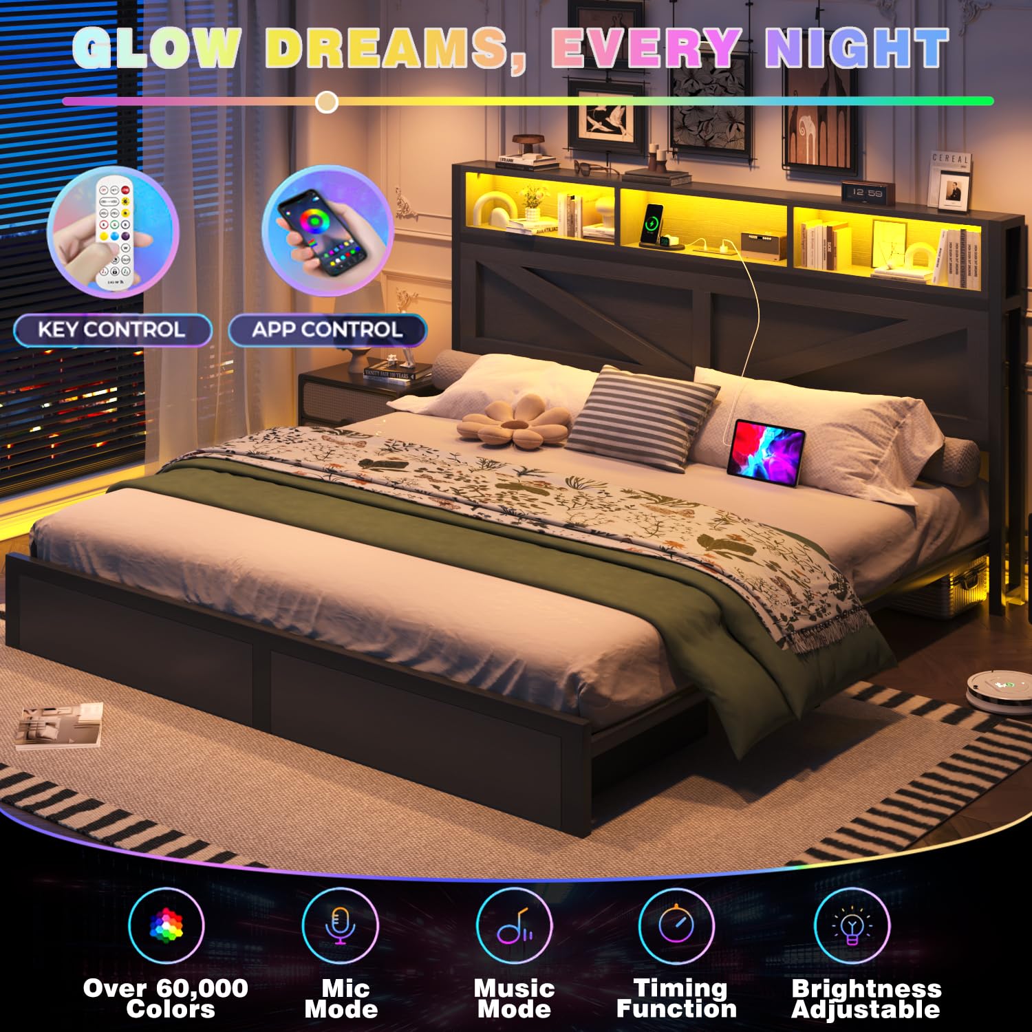 Incyneva Farmhouse King Bed Frame with Bookcase Storage Headboard, Charging Station, LED Light and 2 Storage Drawers, Noise Free, No Box Spring Needed, Black