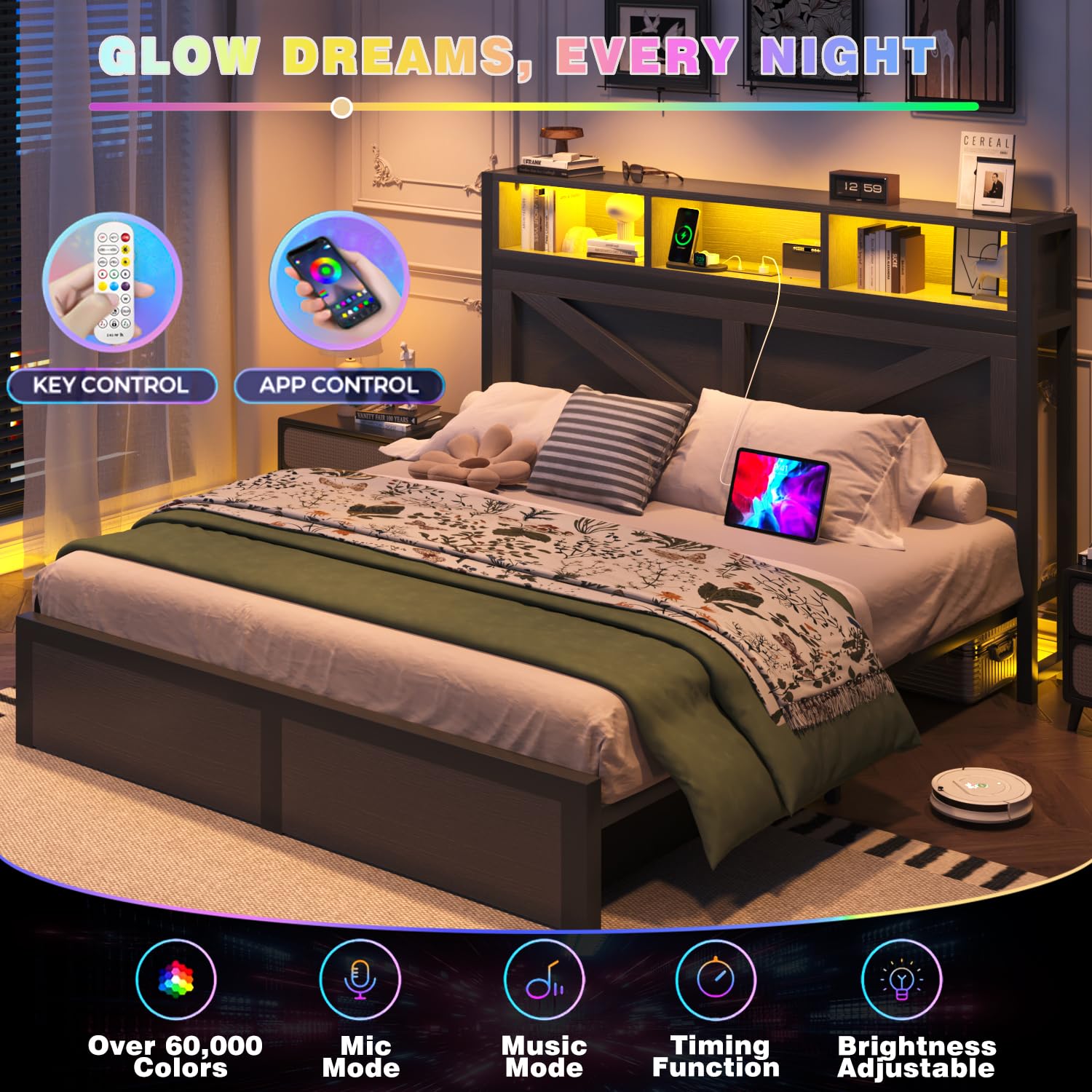 - RGB LED LIGHTS: Queen bed frame with headboard provides vibrant LED lights, different modes adding a dynamic touch to your bedroom ambiance
