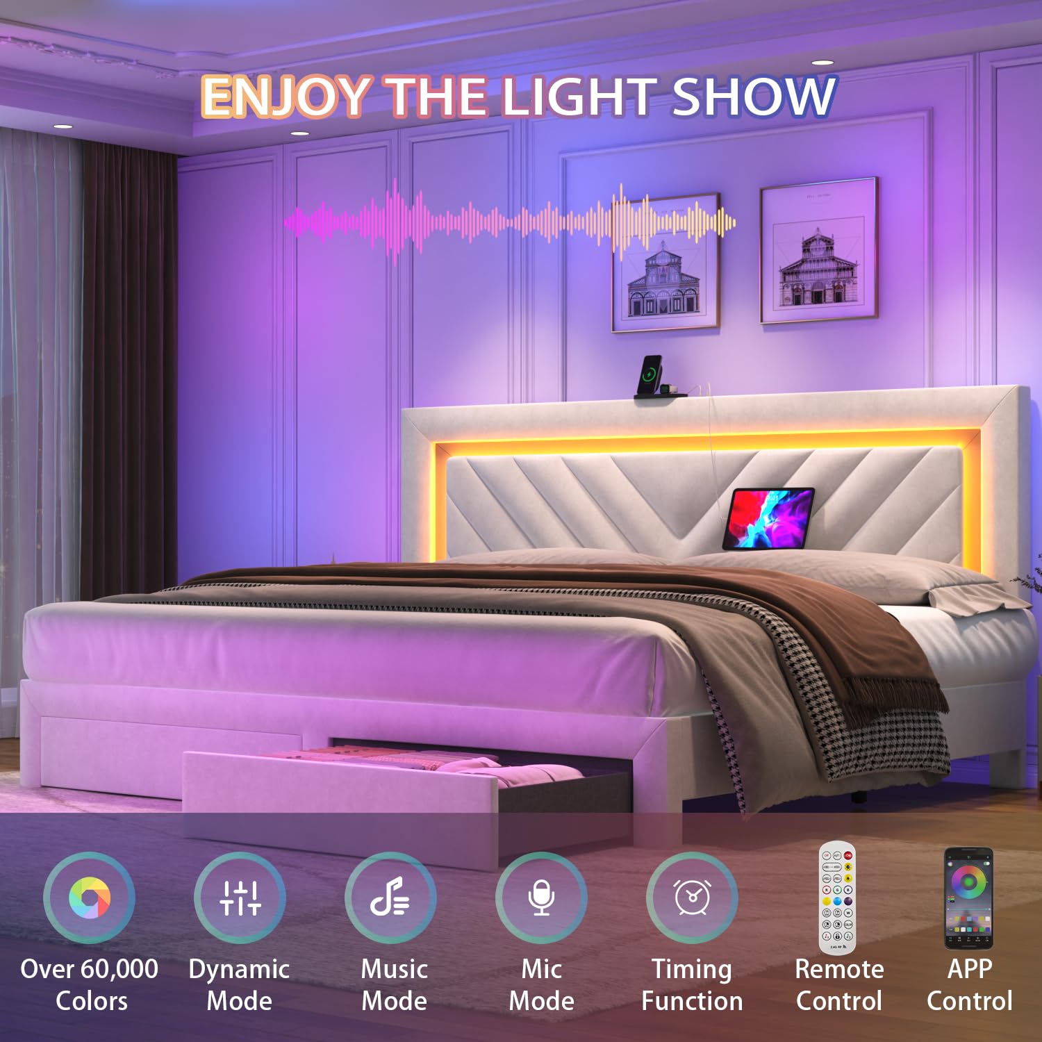 - RGB LED Lights: Bed frame king size features integrated LED lights, customize the lighting to match your mood or decor with the color settings