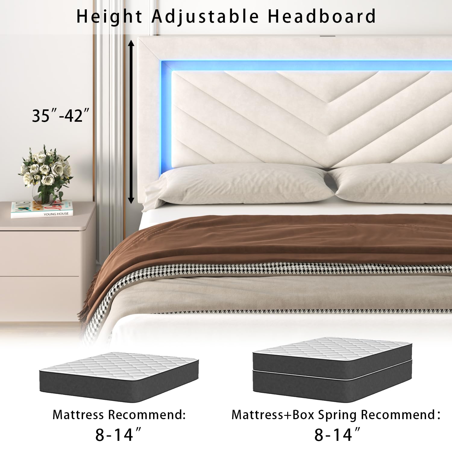 - Height Adjustable Headboard: King bed frame with storage offers 34-42 inches height adjustable inches headboard, accommodating mattress thickness from 8-14 inches
