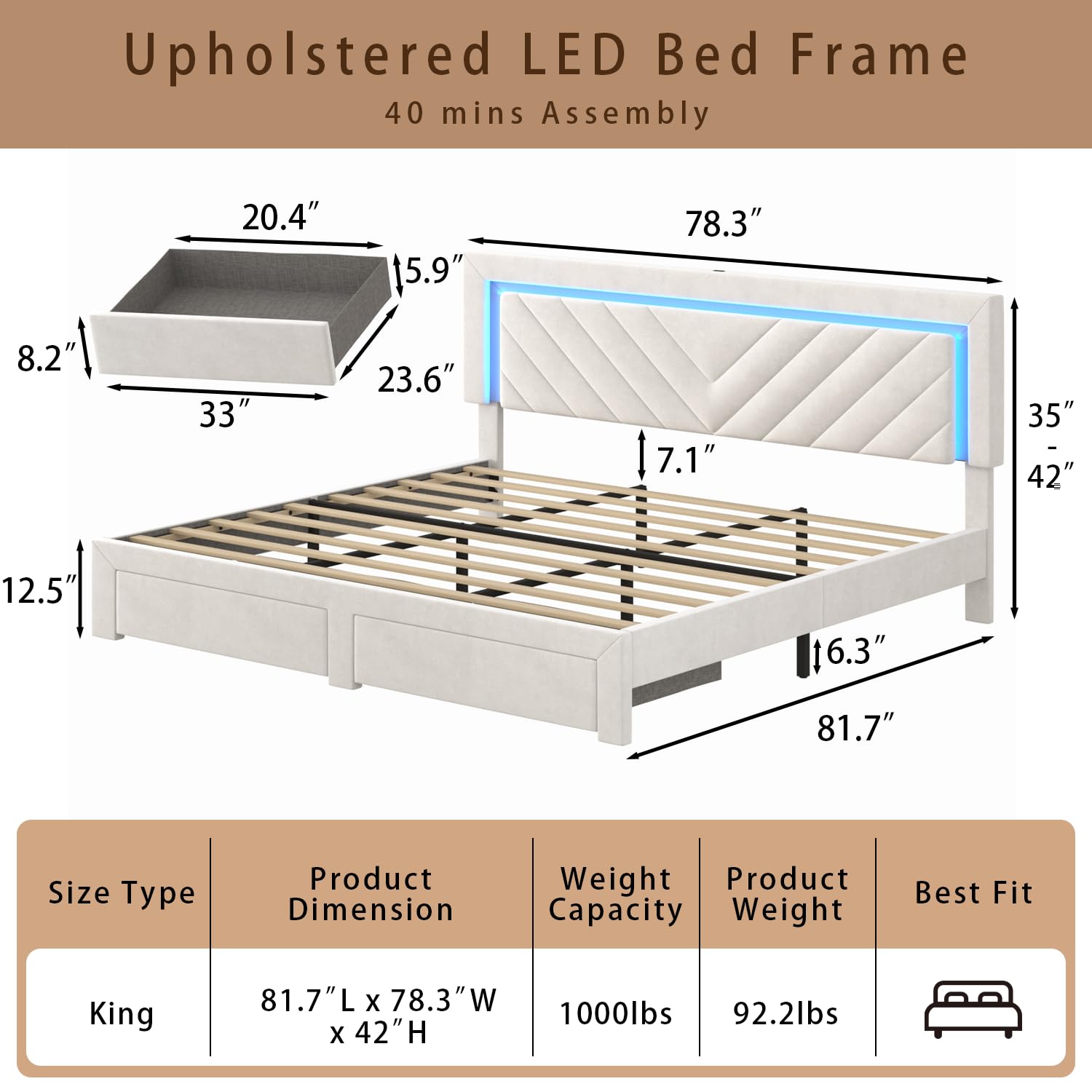 - Storage Drawer: King bed frame with storage drawer, perfect for storing extra bedding, clothing, or any other items, keeping your bedroom tidy and organized