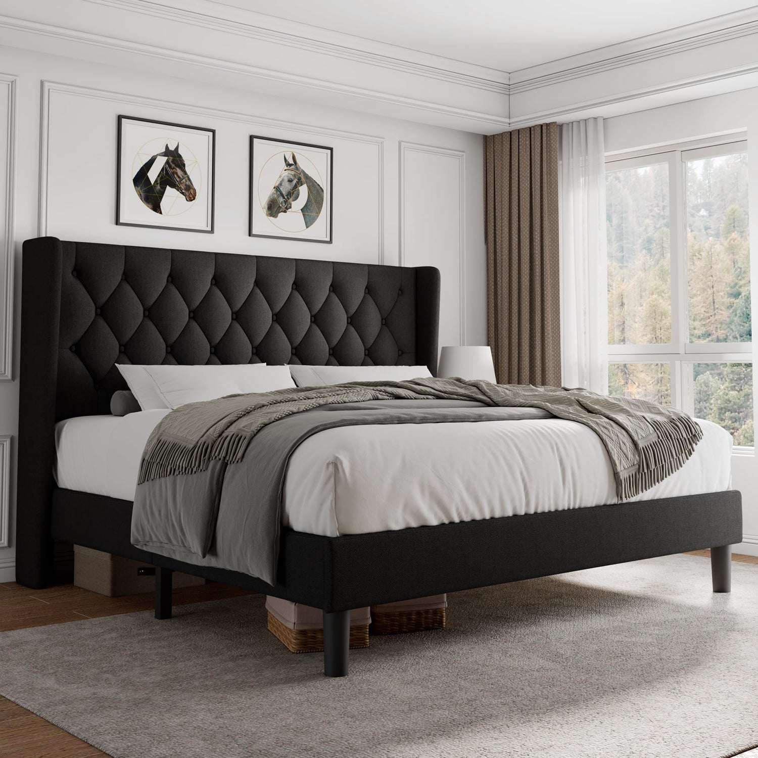 - Upholstered Bed Frame: This wingback bed frame features a soft and comfortable button tufted headboard that you can easily lean against. The winged sides not only secure your pillows but also provide a convenient shelf on top, perfect for placing glasses and phones, making it both practical and functional