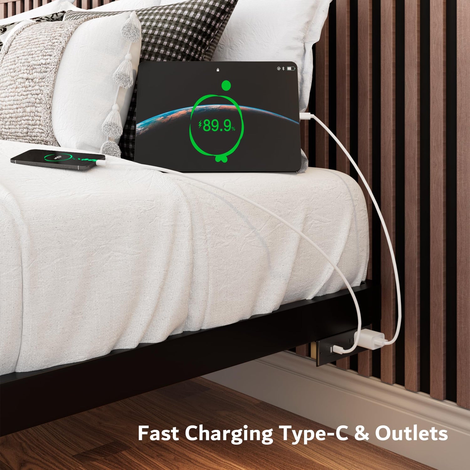 This striking bed frame comes equipped with a smart charging station, featuring built-in Type-C and USB ports, along with two standard outlets. Say goodbye to clutter and stay connected, as this functional addition caters to all your charging needs, ensuring your devices are always powered and ready.