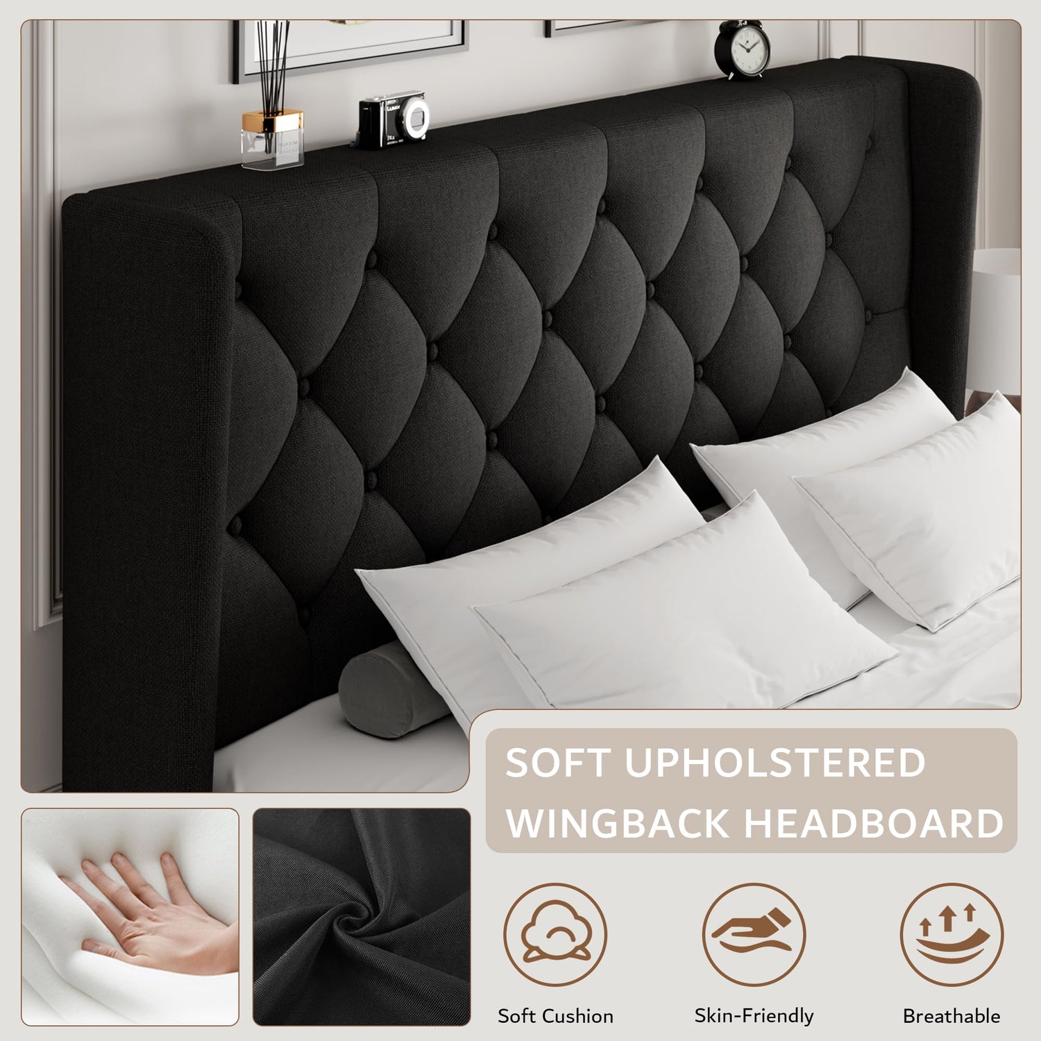 iPormis Queen Size Platform Bed Frame with Button Tufted Headboard, Upholstered Bed Frame with Solid Wooden Slats, 8" Underbed Space, No Box Spring Needed, Noise Free, Easy Assembly, Black