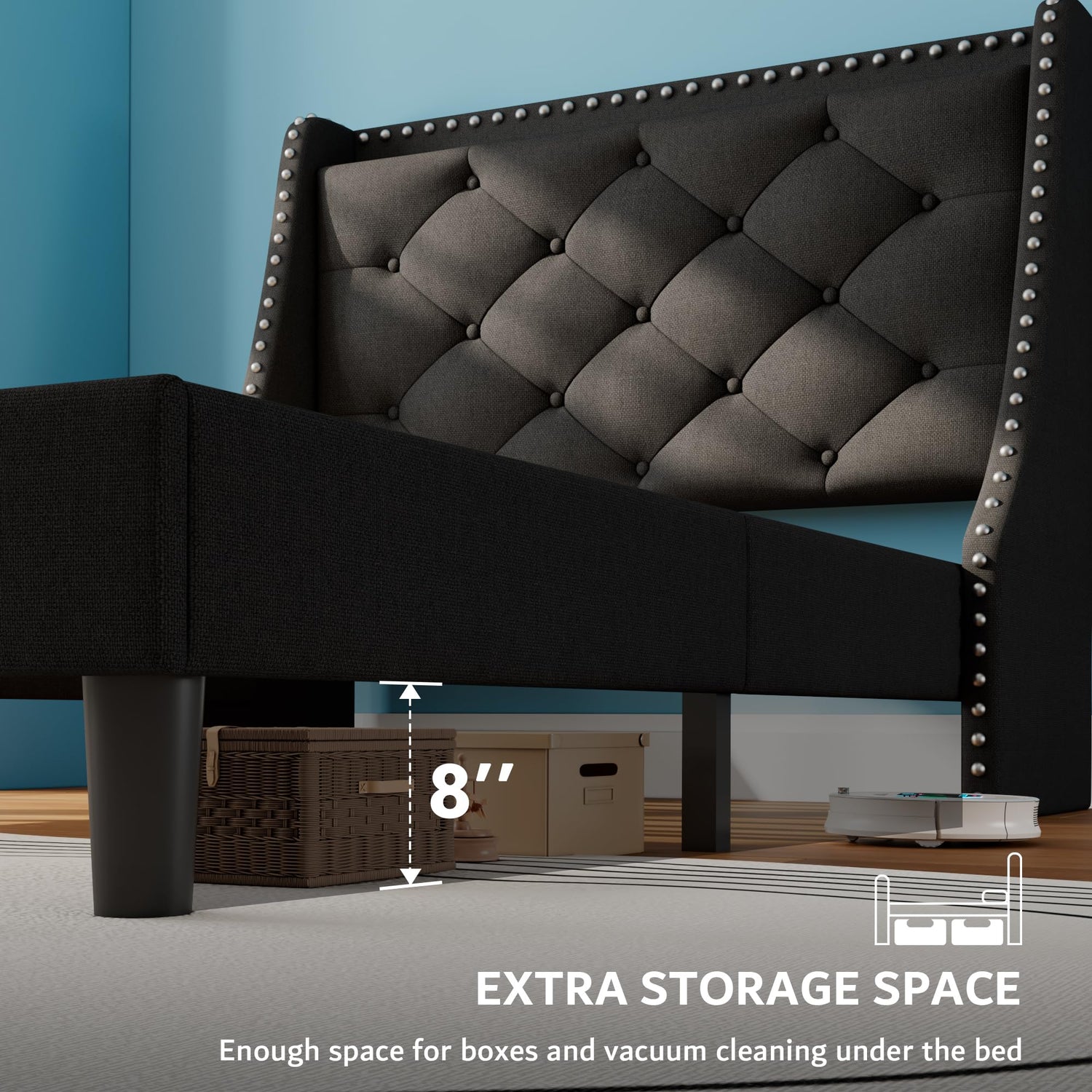 iPormis Twin Bed Frame with 16" Comfort Wingback & Charging Station, Upholstered Platform Bed with Button Tufted Storage Headboard, Solid Wood Slats Support, No Box Spring Needed, Black