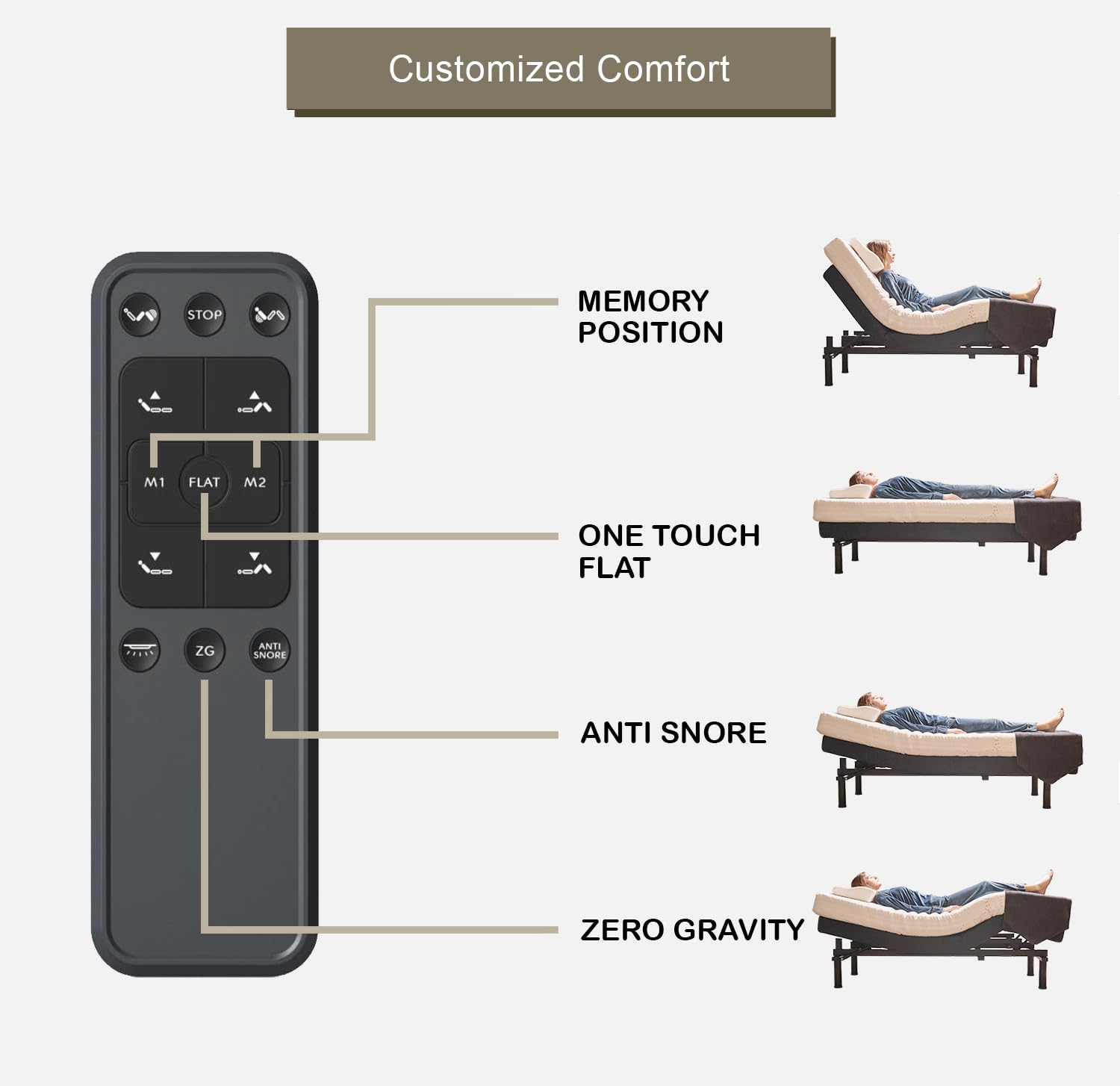 • CONTROLLED COMFORT - This adjustable bed not only inclines at the head by 75 degrees and the feet by 45 degrees, you can also use the Zero Gravity, Anti Snore, One Touch Flat, or program your own position.