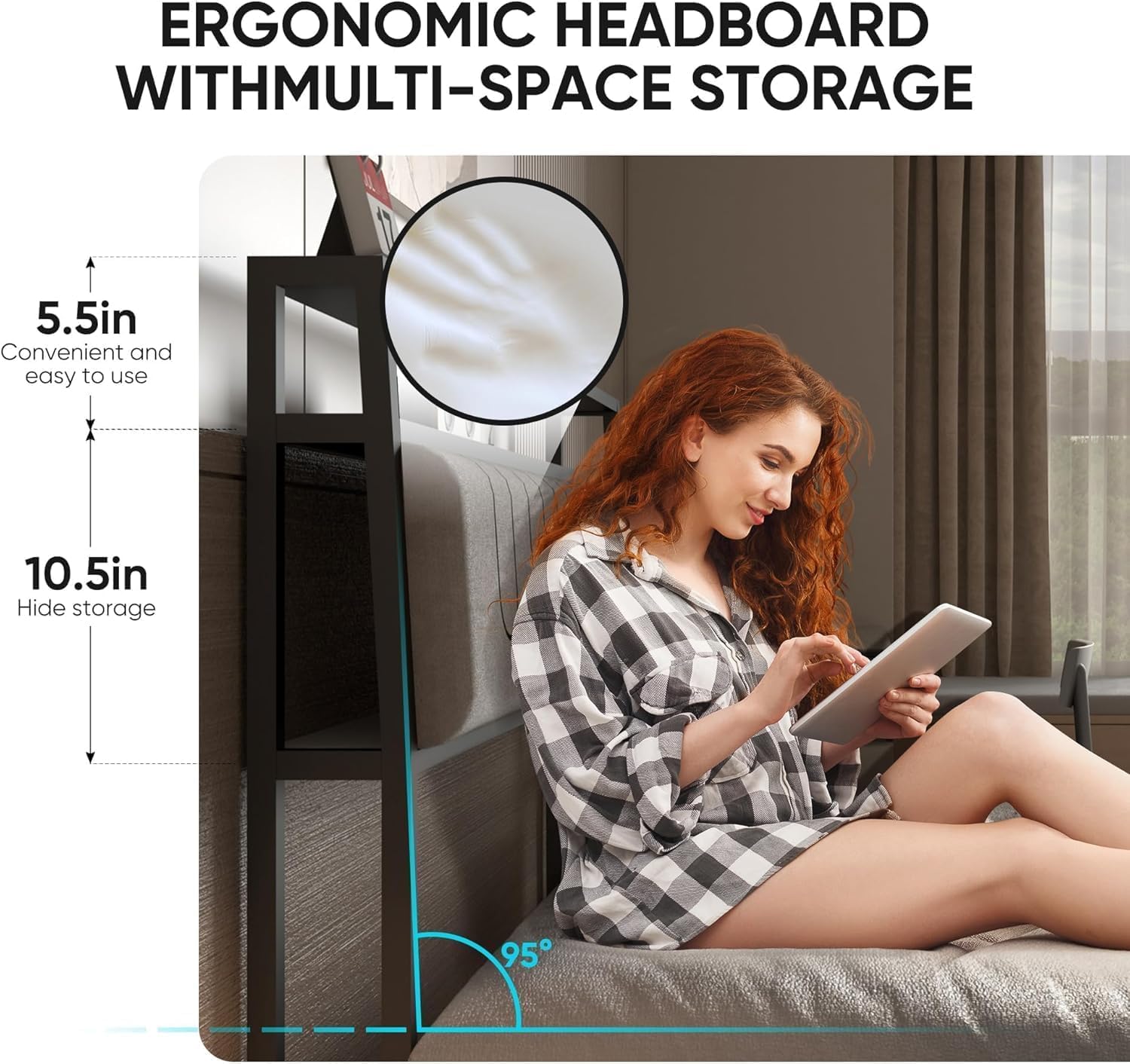 • MULTIFUNCTIONAL STORAGE SPACE: This full bed frame with storage comes with 2 tiers of storage shelves on the headboard, which can easily organize small items such as cell phones, glasses and books. The underbed storage space can easily store luggage, shoeboxes and some organizers, and the sweeper can easily pass through to keep the bedroom clean and tidy.