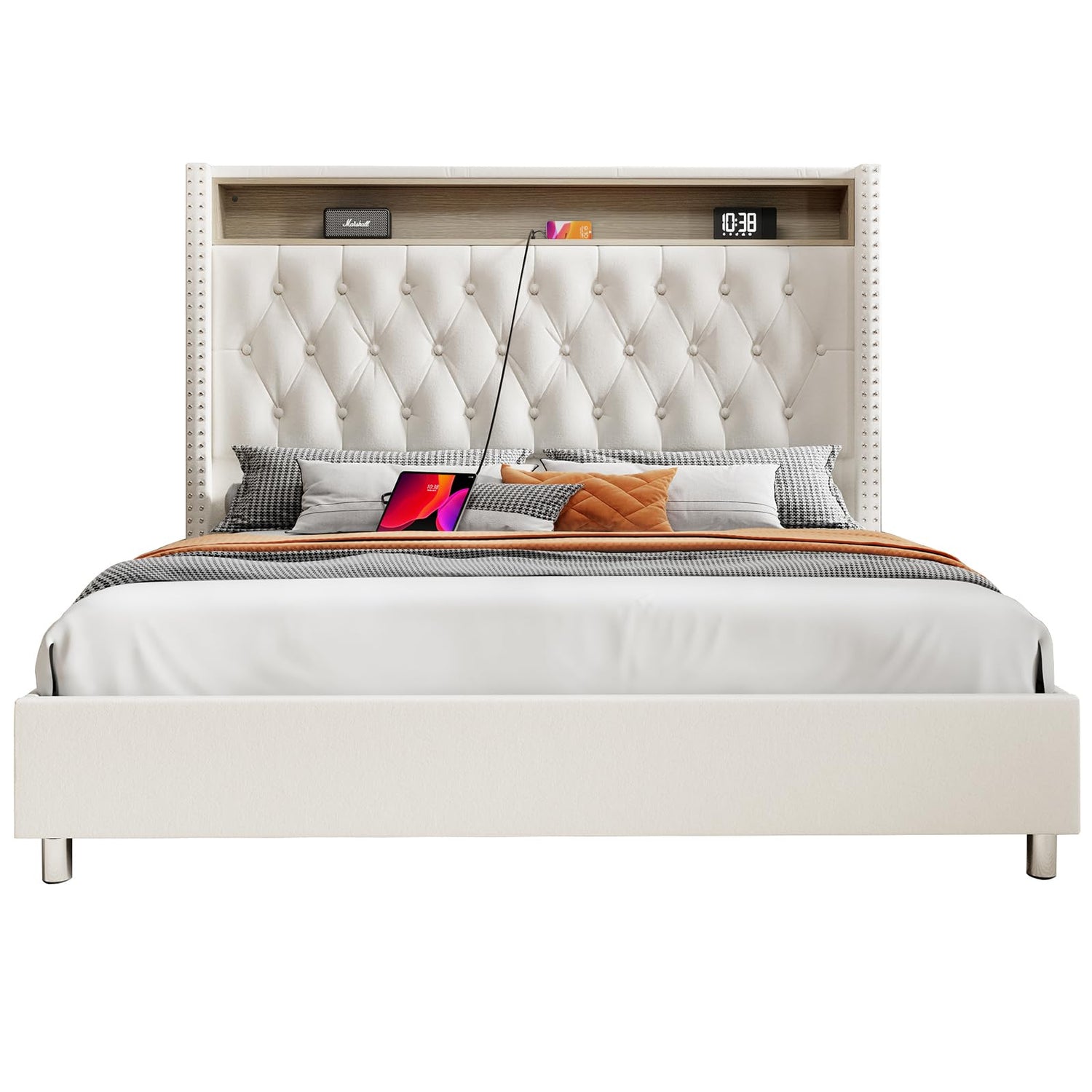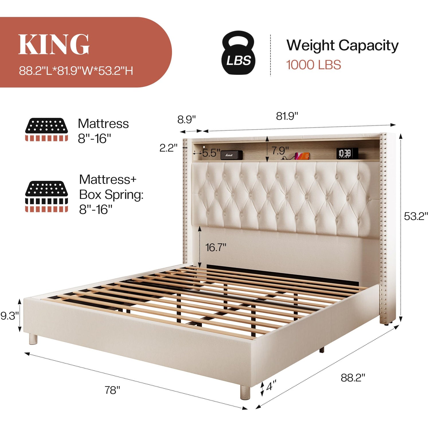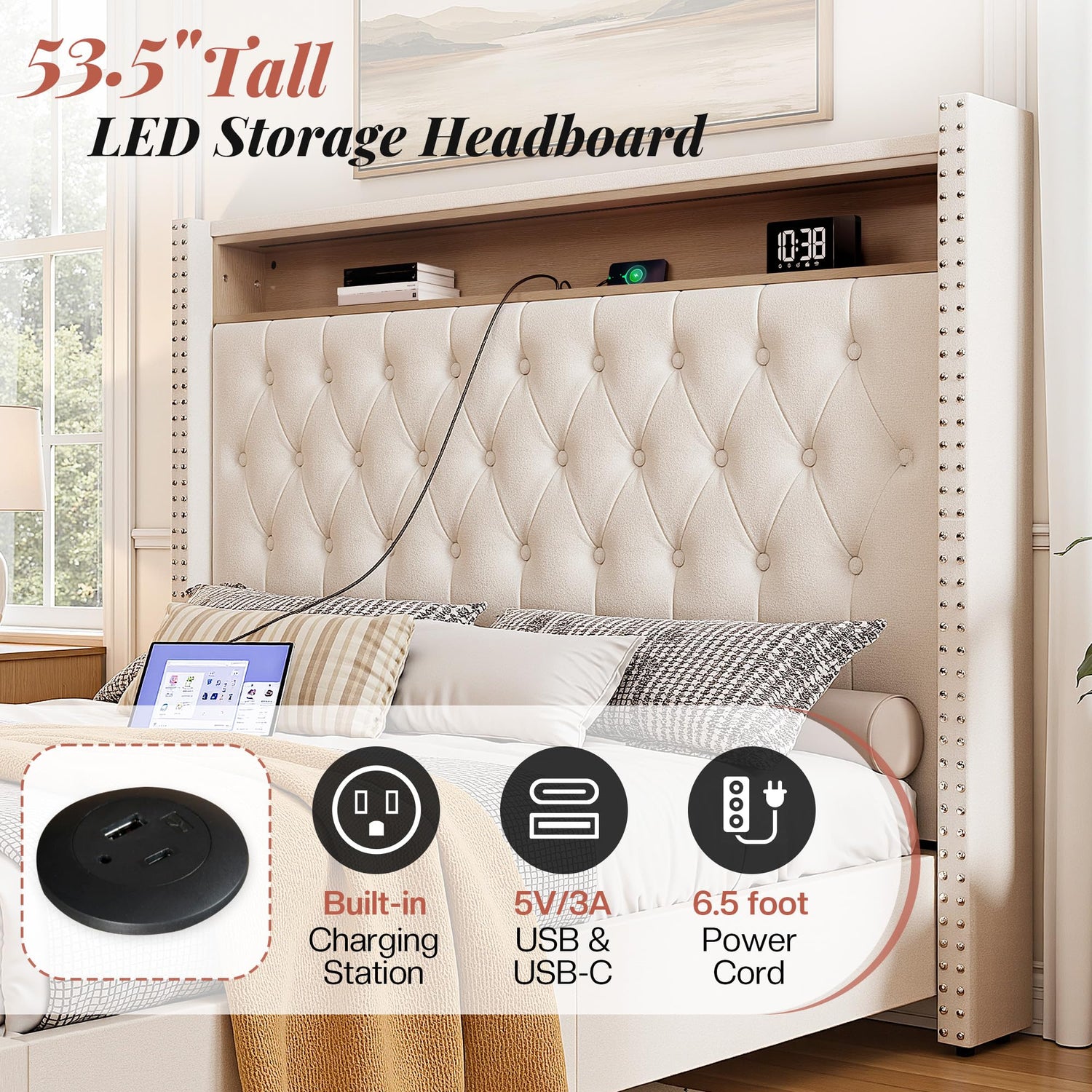 Jocisland King Size Bed Frame 53.6'' Tall Storage Headboard with LED Lights & Charging Station, Velvet Upholstered Button Tufted Wingback Platform Beds, No Box Spring Needed, USB Ports, Cream
