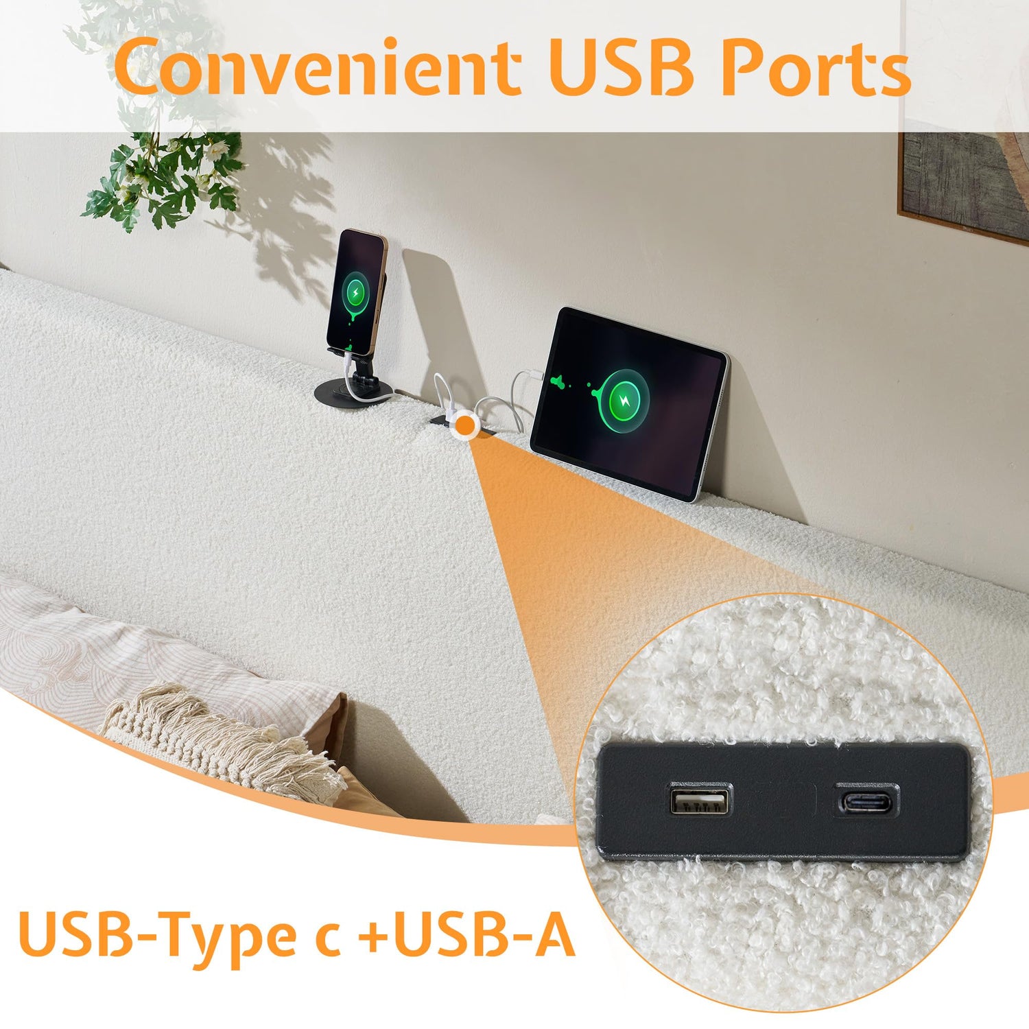 Jocisland King Size Bed Frame, Boucle Upholstered Bed Frame with Charging Station, Platform Bed with Soft Rounded Corners, Easy Assembly, No Box Spring Required, White