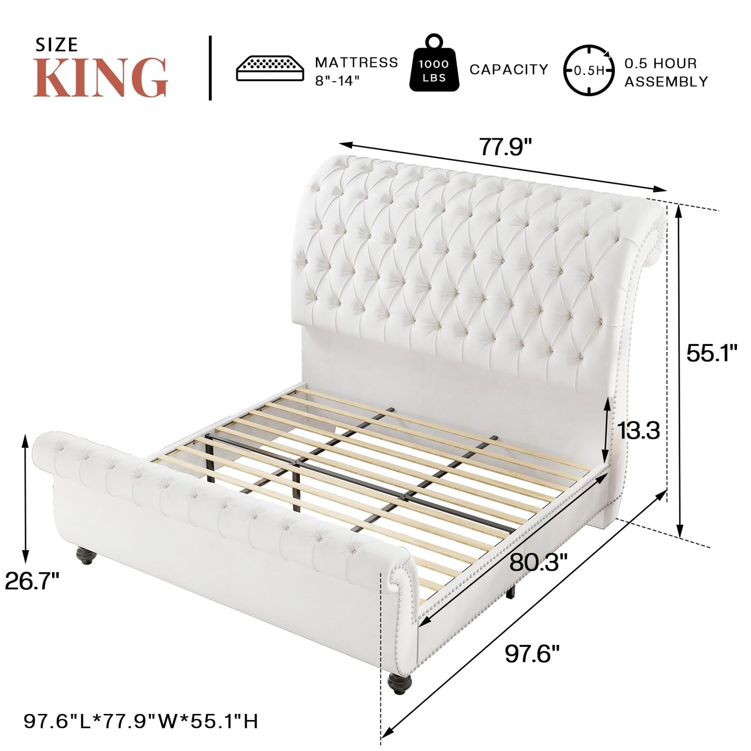 - 55" High Headboard: The impressive 55" high tufted scroll headboard adds both beauty and practicality. Its height accommodates thicker mattresses and layered bedding, providing enhanced back support for a relaxing lounging experience
