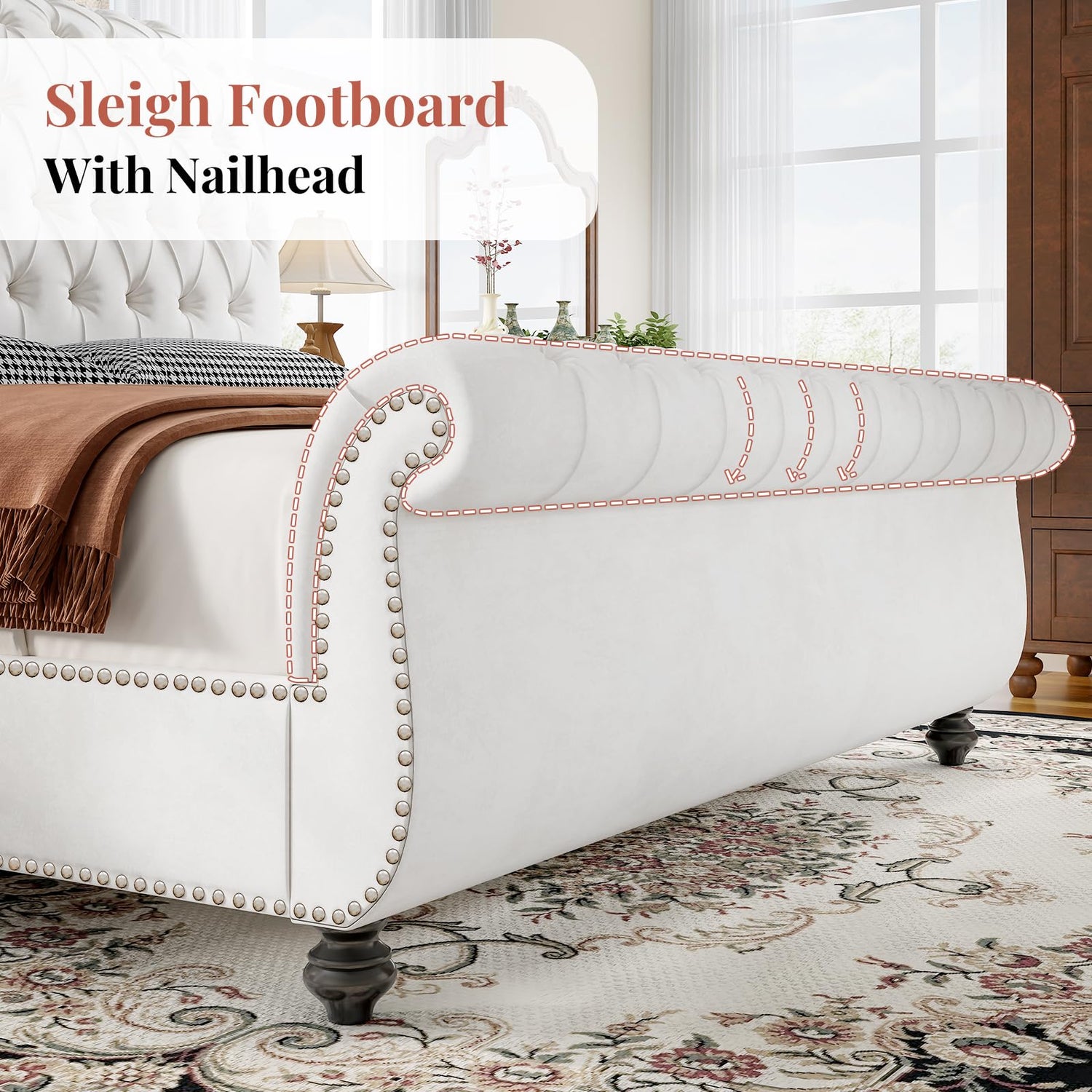 - Classic Sleigh Bed: Featuring a graceful sleigh design with beautifully scroll headboard and footboard, brings a luxurious yet cozy charm to any bedroom. The upholstered bed frame easily complements a range of decor styles, from traditional to modern