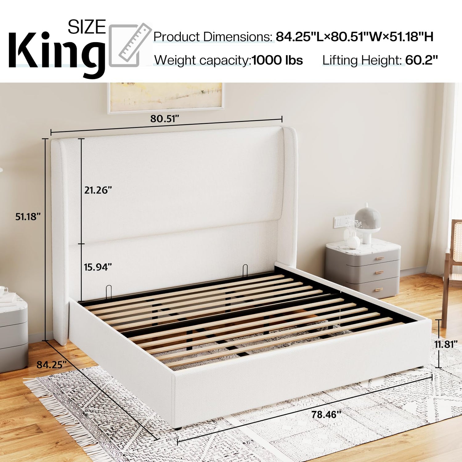 Jocisland King Size Bed Frame with Storage - Upholstered Lift Platform Bed, Wingback Headboard, Hydraulic System, No Box Spring Needed, Wood Slats Support, White