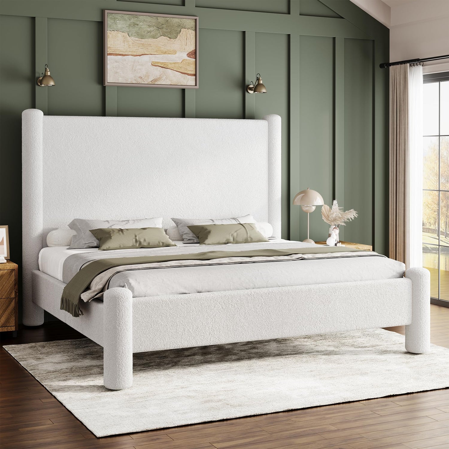 Jocisland King Size Upholstered Bed Frame with Boucle Chenille Fabric, Cloud-Inspired Headboard & Corner Design, Sturdy Platform Bed, No Box Spring Needed, White