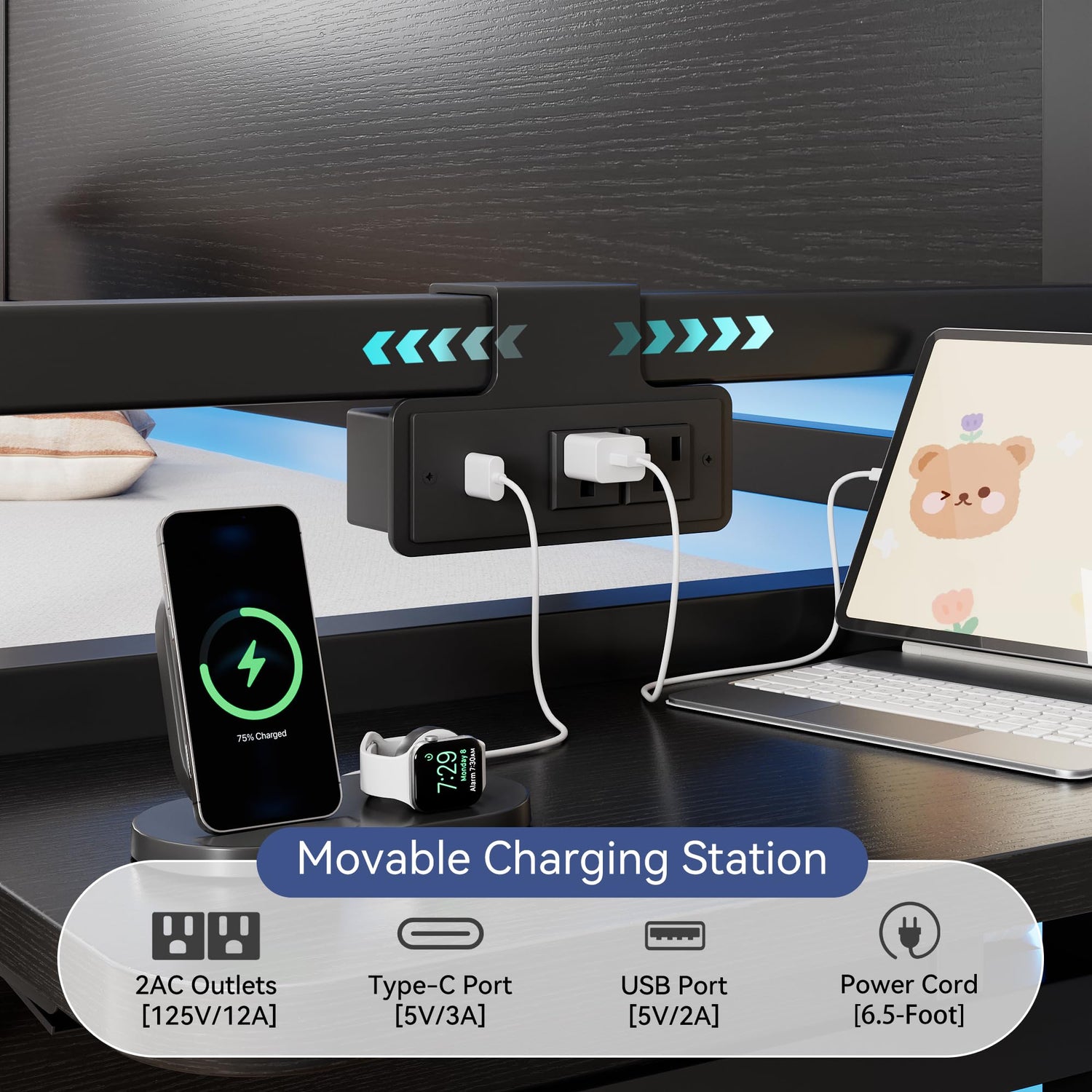 - MOVABLE CHARGING STATION: This metal sofa bed comes with a movable charging station that makes life on the bed easy and convenient. Featuring 2 standard outlets, 2 USB ports, 1 Type-C port and an 8-foot long power cord, the station can be installed anywhere on the upper bed. Ideal for charging phones, iPads or other devices, it keeps power within reach and adds extra functionality