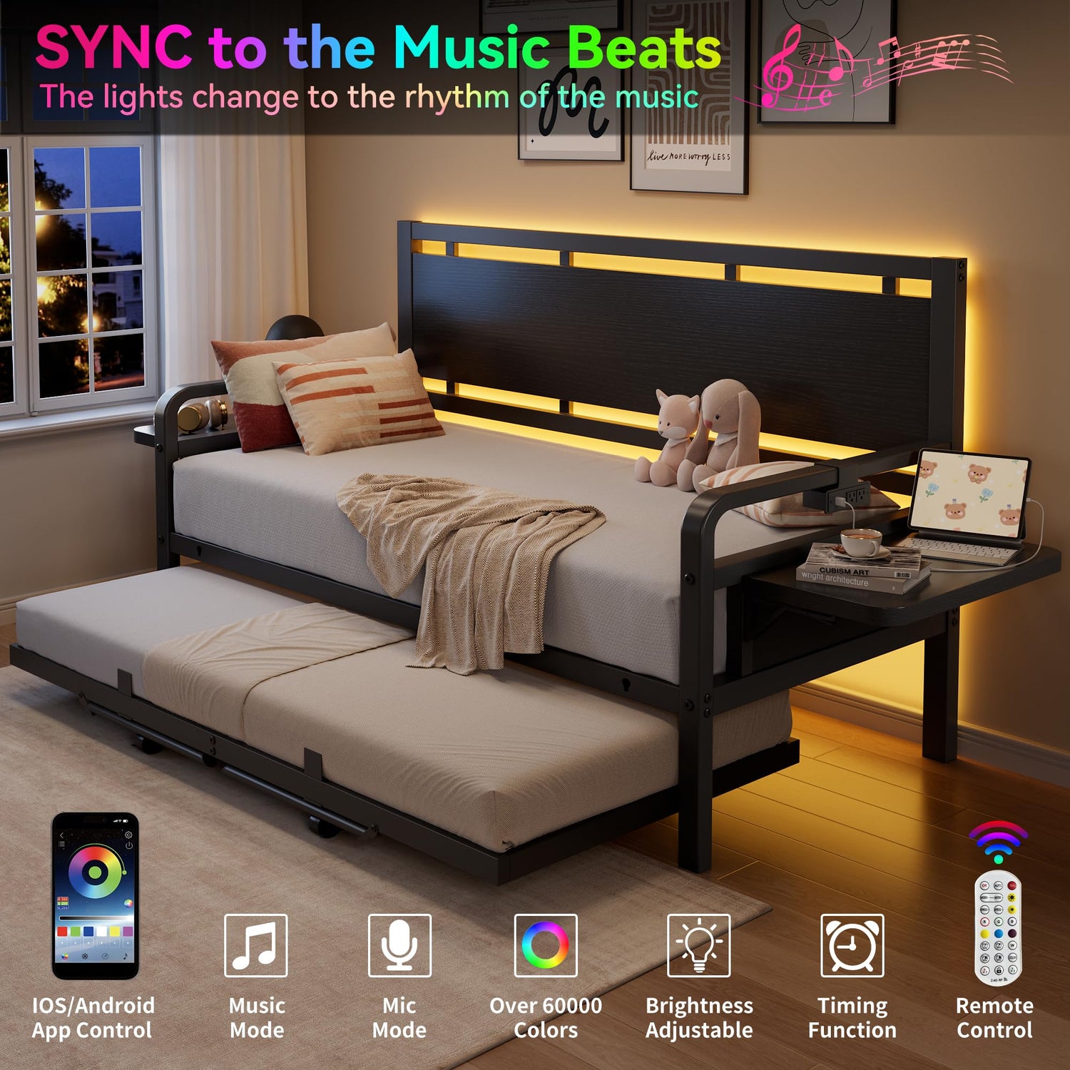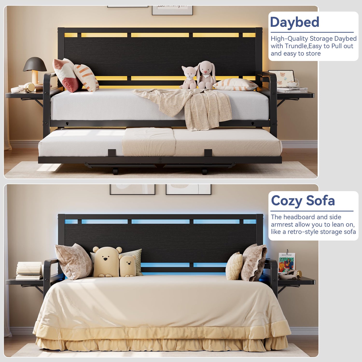 Jocoevol Daybed with Trundle and LED Light, Heavy Duty Metal Twin Bed Frame with Movable Charging Station, Day Bed Pop Up Trundle Bed Twin for Living Room, Bedroom and Guest Room, Black
