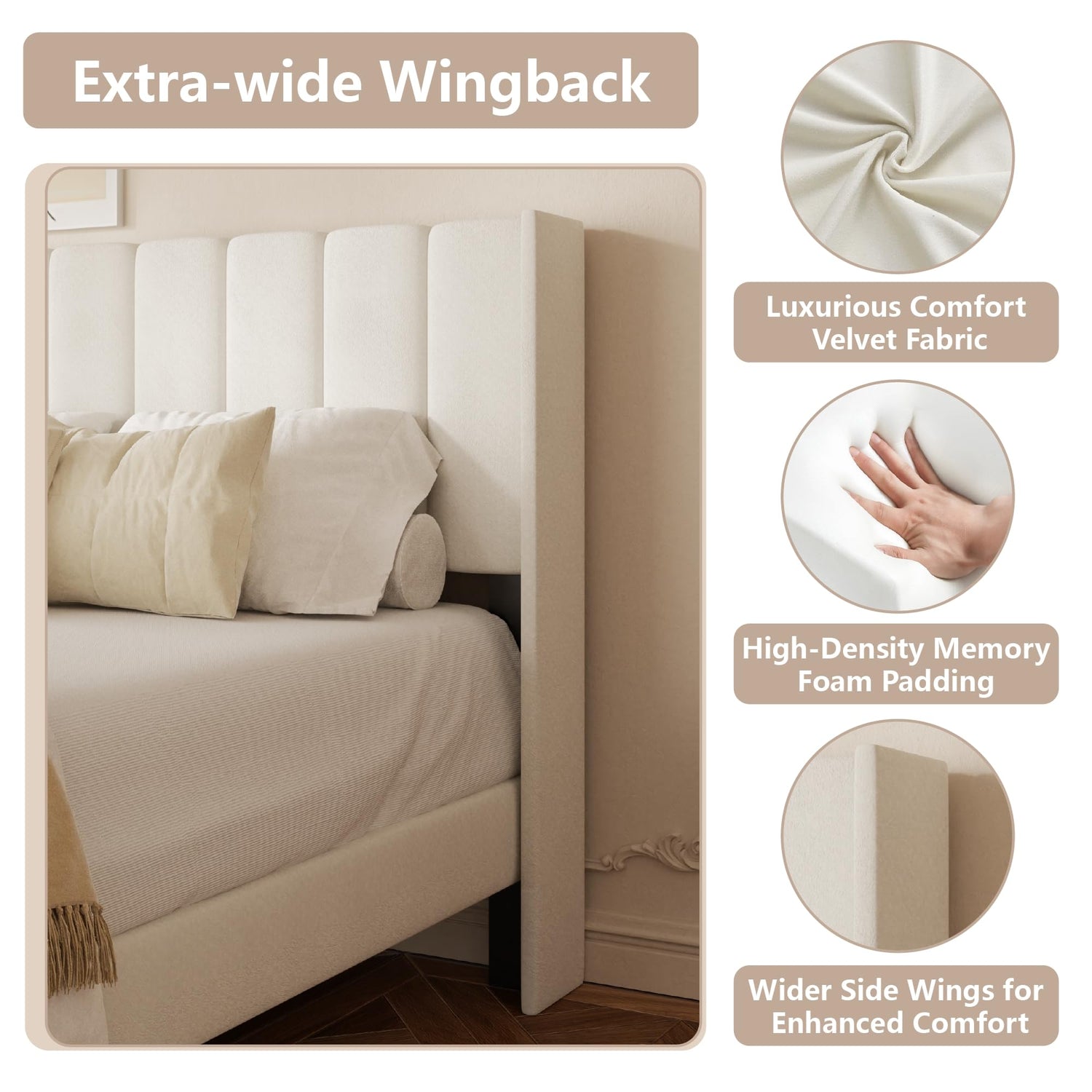 King Size Bed Frame with Vertical Chanel Tufted Headboard and Wingback, Upholstered Platform Bed, Strong Wooden Slats, Easy Assembly, Noise Free, No Box Spring Needed, Beige Velvet