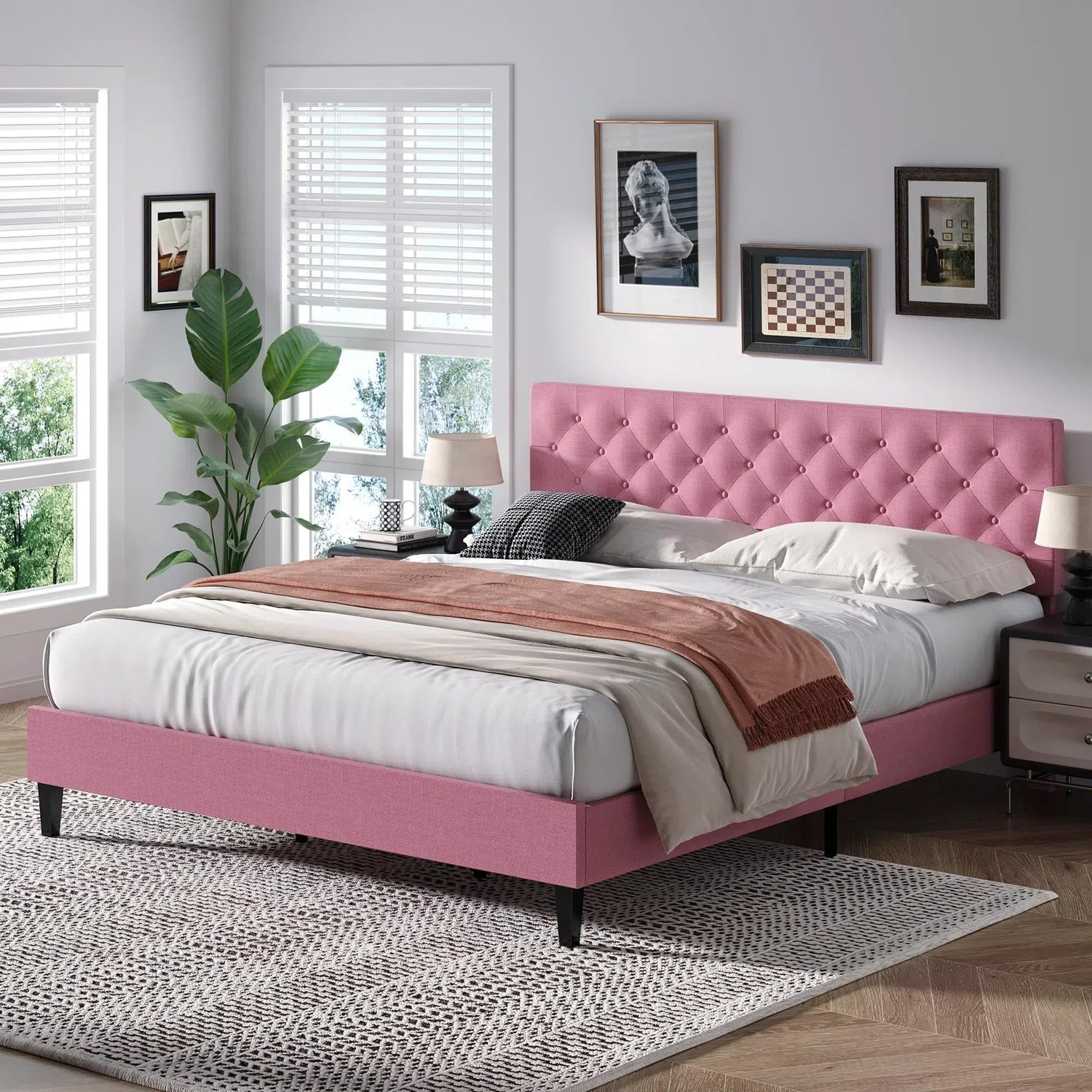 King Size Platform Bed Frame, Fabric Upholstered Bed with Button Tufted Headboard, Adjustable Headboard Design, Easy Assembly, No Box Spring Required, Pink
