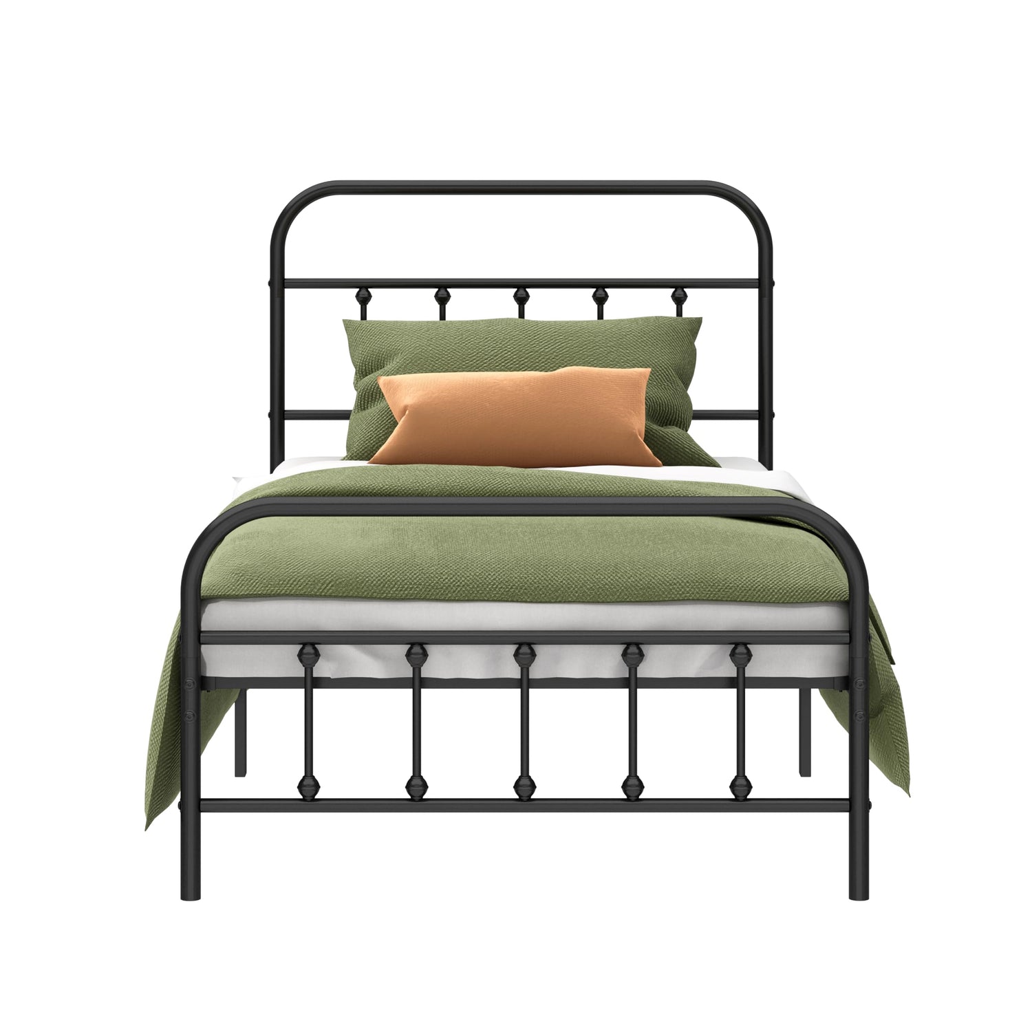 - FEATURES: This Twin bed frame has a wrought iron frame and a European style bed post which makes it very simple and beautiful. The corners of the Twin bed frame are polished to be a little round not to scratch us and very easy to clean with a damp cloth .