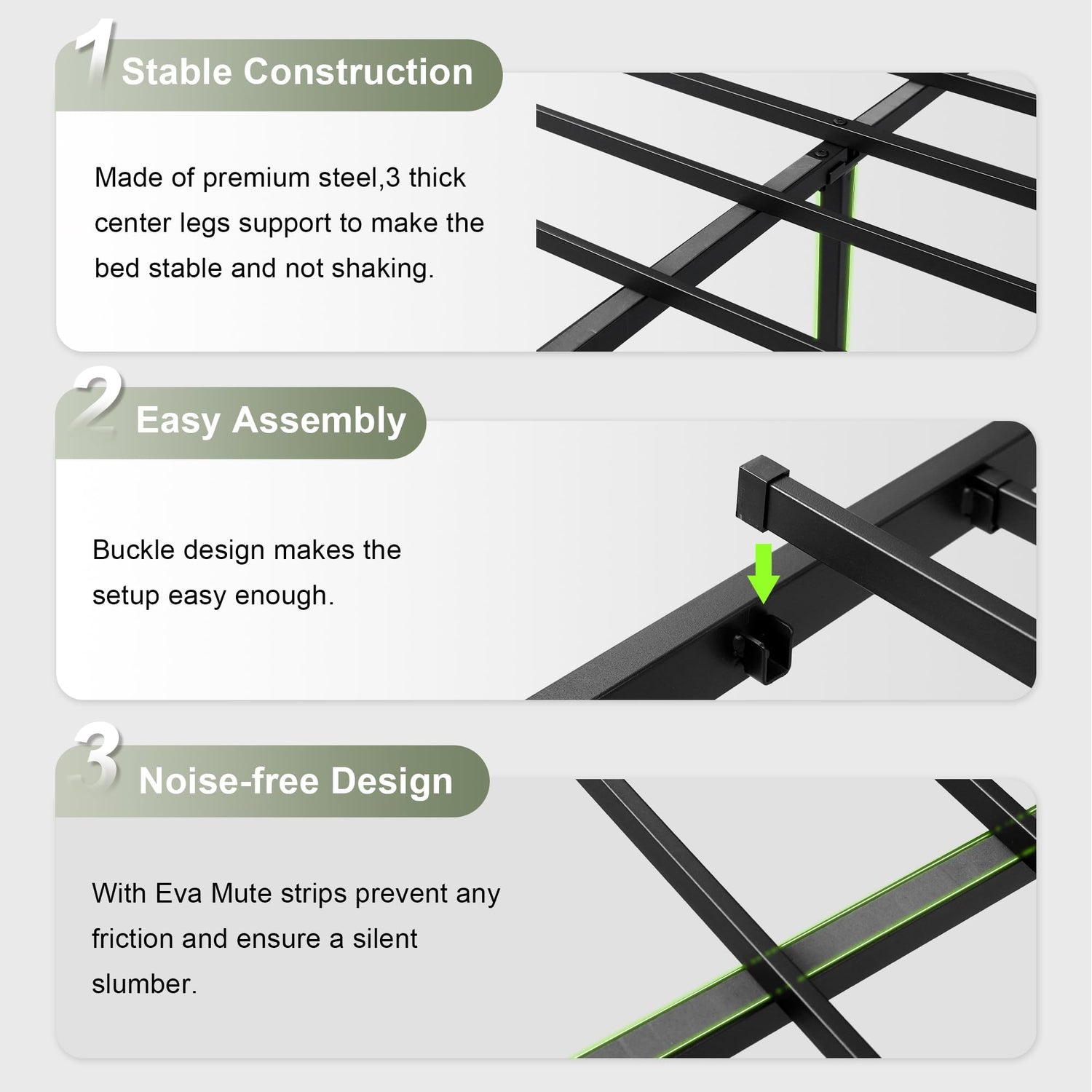 • Stable & Durable: 13 pieces of stable metal slats and 9 thick legs support this king bed which provides firm, rigid support to your mattress. Ensures long-lasting durability and stability. Round corner design avoids injuries from inadvertent impacts