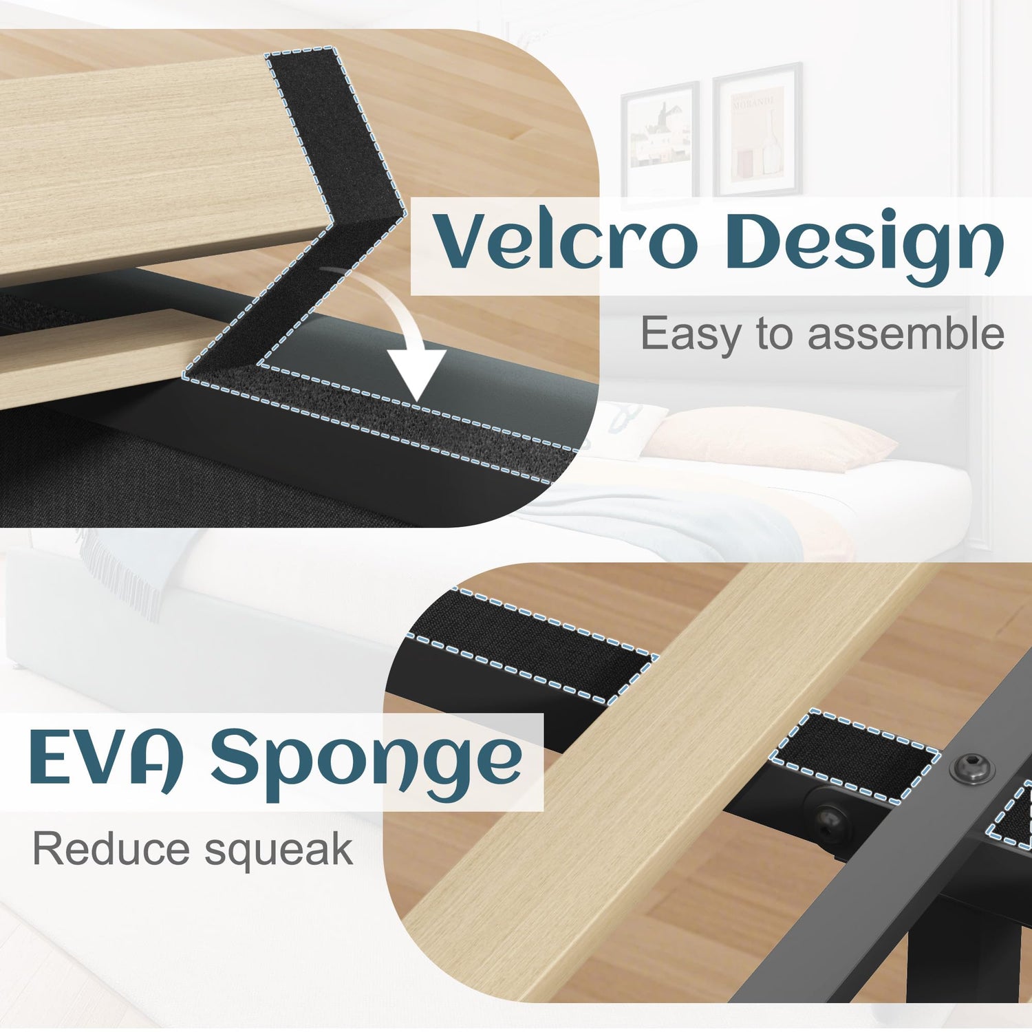 - 【Modern Elegant Design Queen Size Bed Frame with Storage】 With a simple contemporary design, this queen bed frame with headboard will add colour to your bedroom and put you in a sunny mood every day. The upholstered queen size bed frame with storage is encased in a soft velvet fabric and filled with highly resilient foam that is soft and skin-friendly. Meanwhile, the soft pockets around the queen size bed frame are designed so that you don't have to worry about possibly bumping your feet