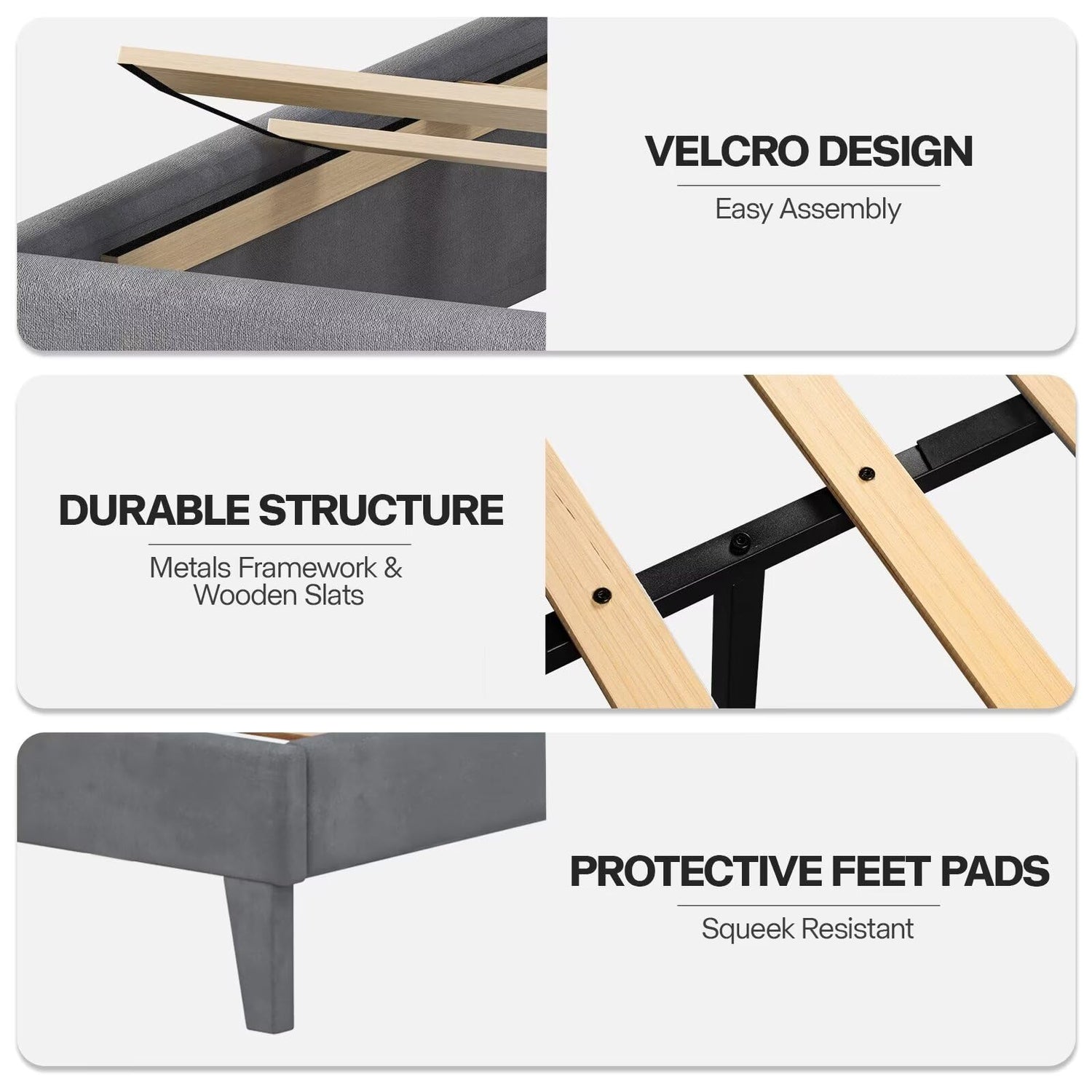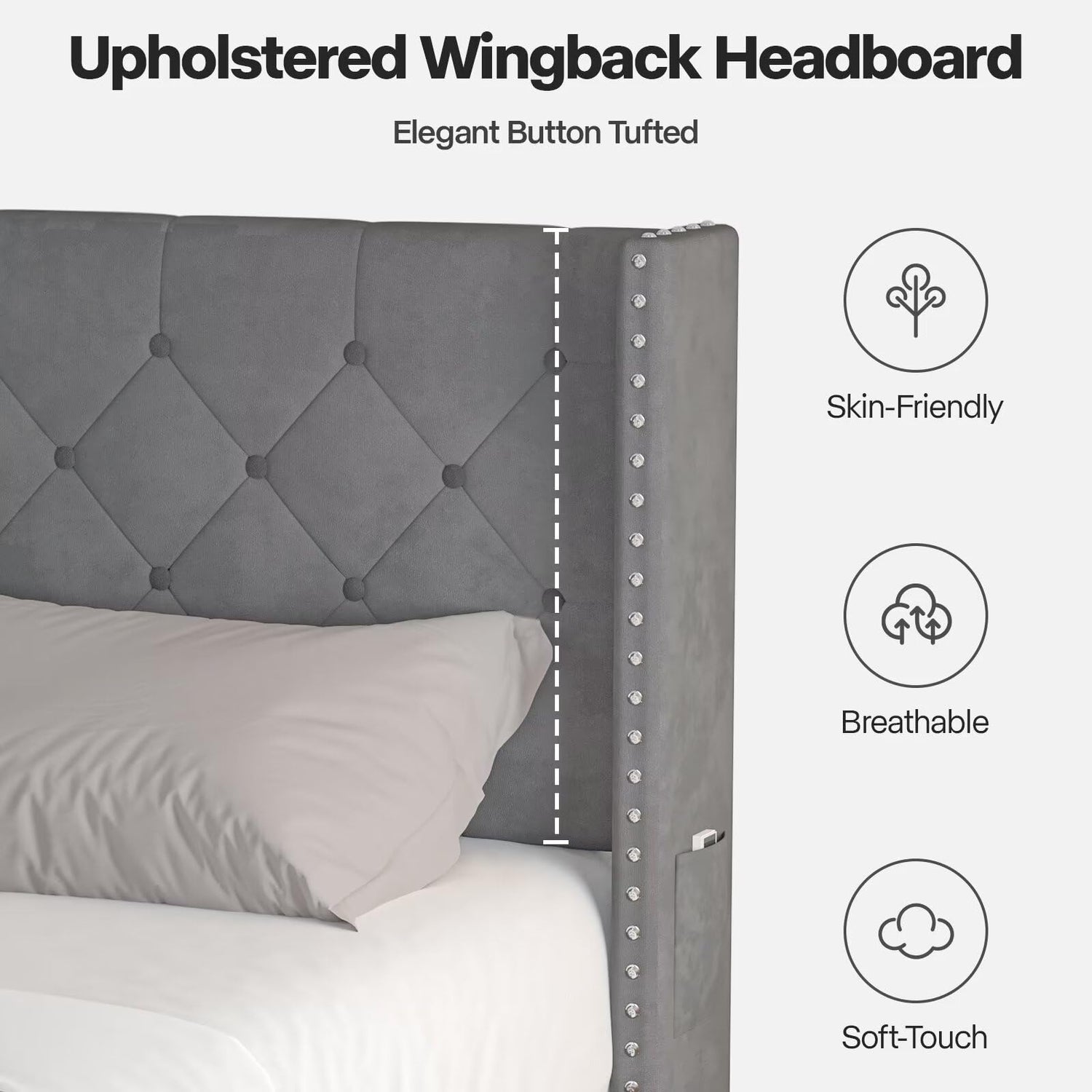 • LUXURIOUS UPHOLSTERED PLATFORM BED: With a Button tufted velvet headboard design and modern nailhead trim style, this grey upholstered bed frame full size will look stylish and warm in any bedroom.With a upholstered headboard and footboard upholstered in premium quality velvet fabric and memory foam padding, providing the ultimate in luxury and skin-friendly touch. Never worry about the pain of bumping into the headboard again!