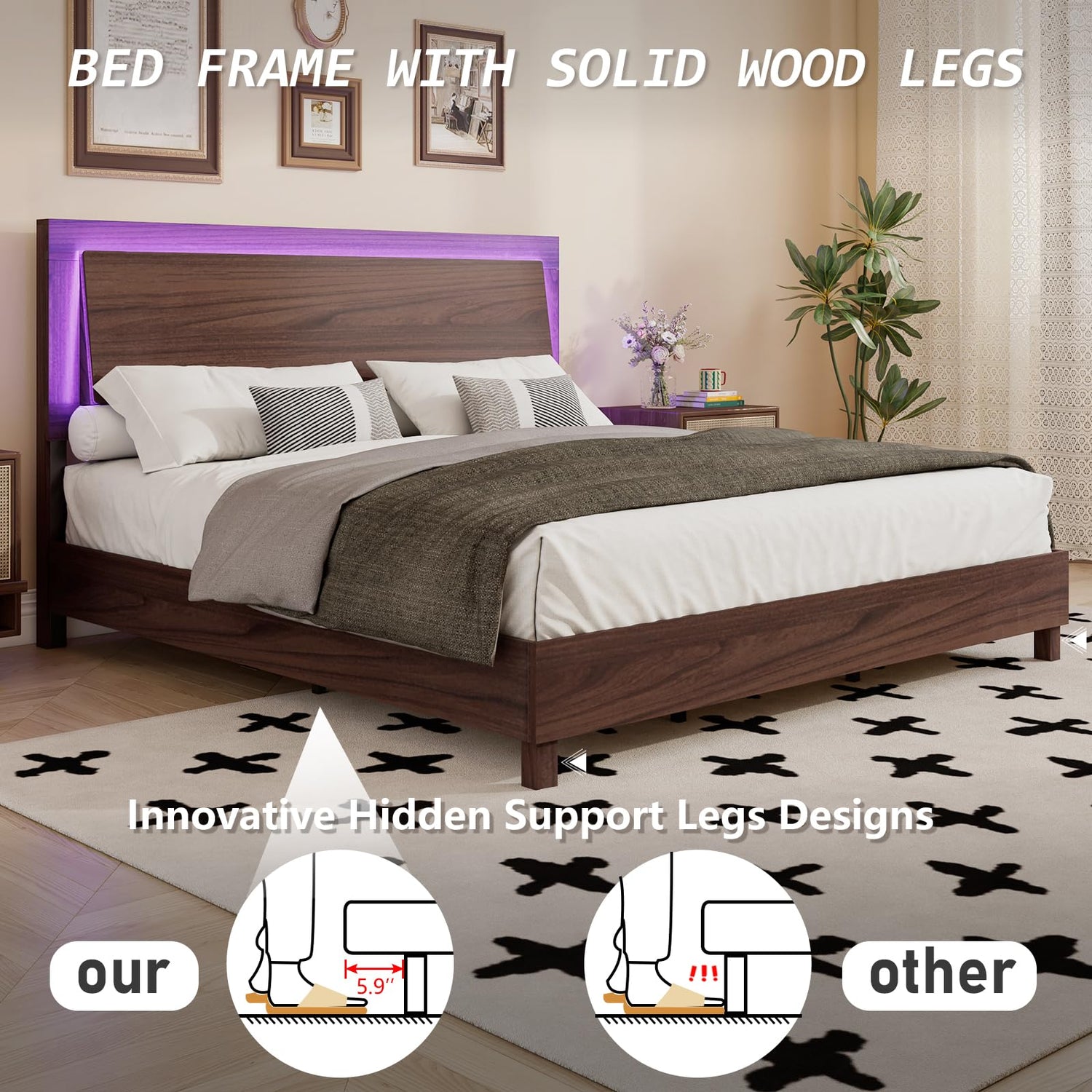 Transform your bedroom into a stylish sanctuary with the LUXOAK Mid-Century Modern King Size Wood Bed Frame, where comfort meets sophistication.