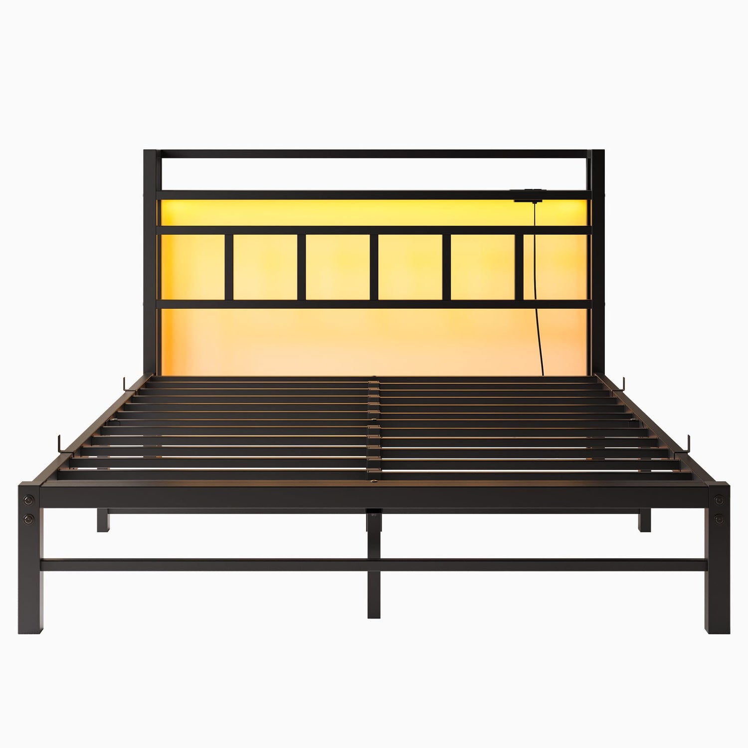 Maliacife Full Size Bed Frame with USB Charging Station, LED Bed with Wood Storage Headboard, Black Metal Platform Bed,Heavy Duty Steel Slats Support,No Box Spring Needed, Noise Free,Easy Assembly