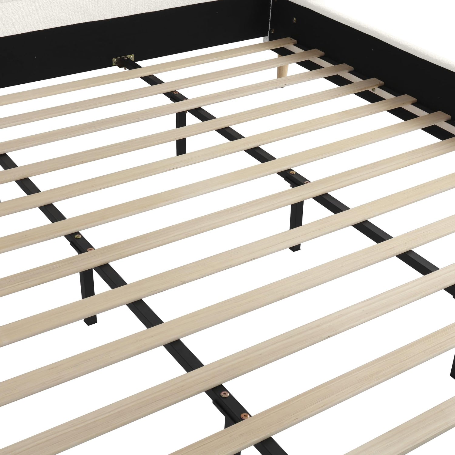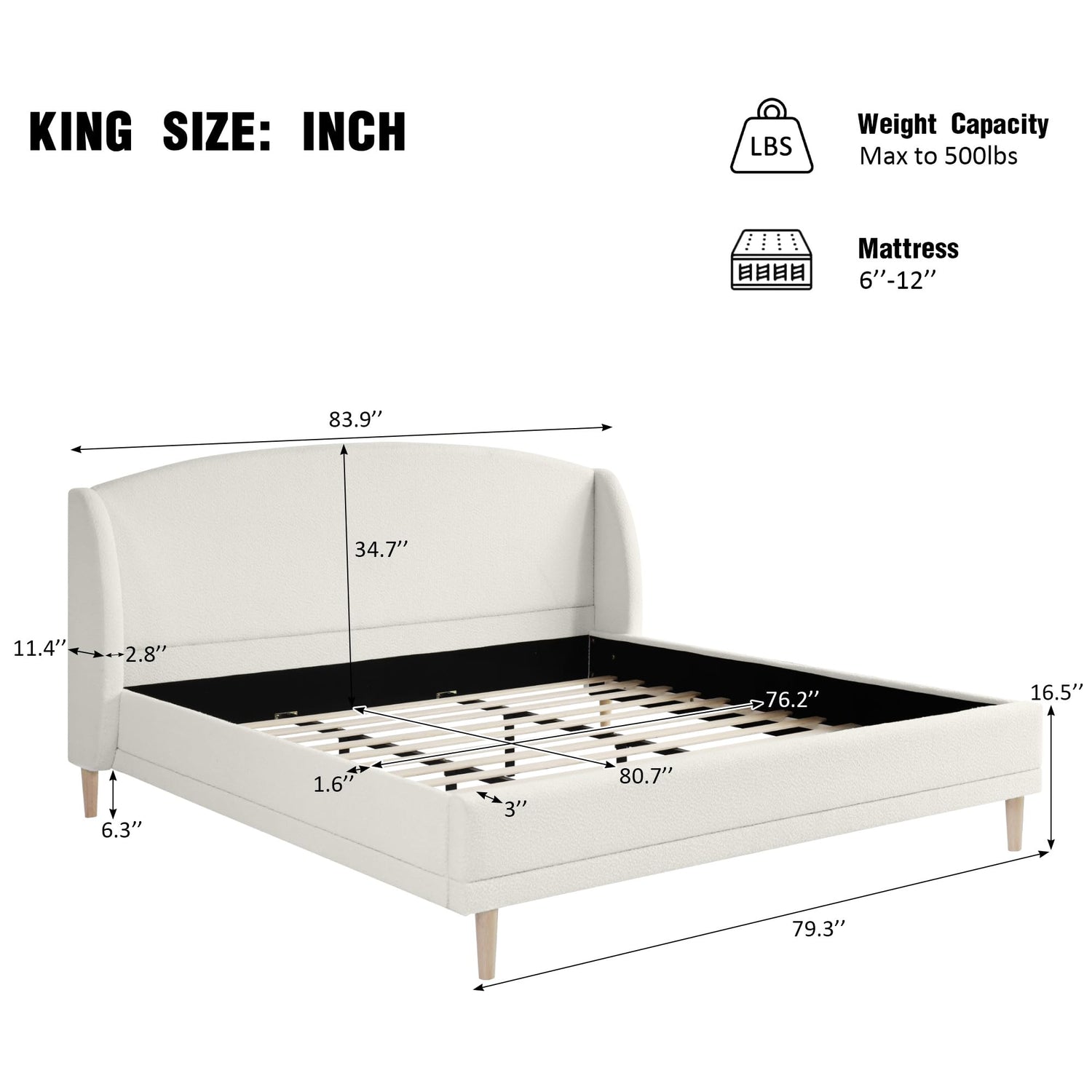 Merax King Size Upholstered Platform Bed, Boucle Fabric and Wingback Headboard, Rounded Corners, White