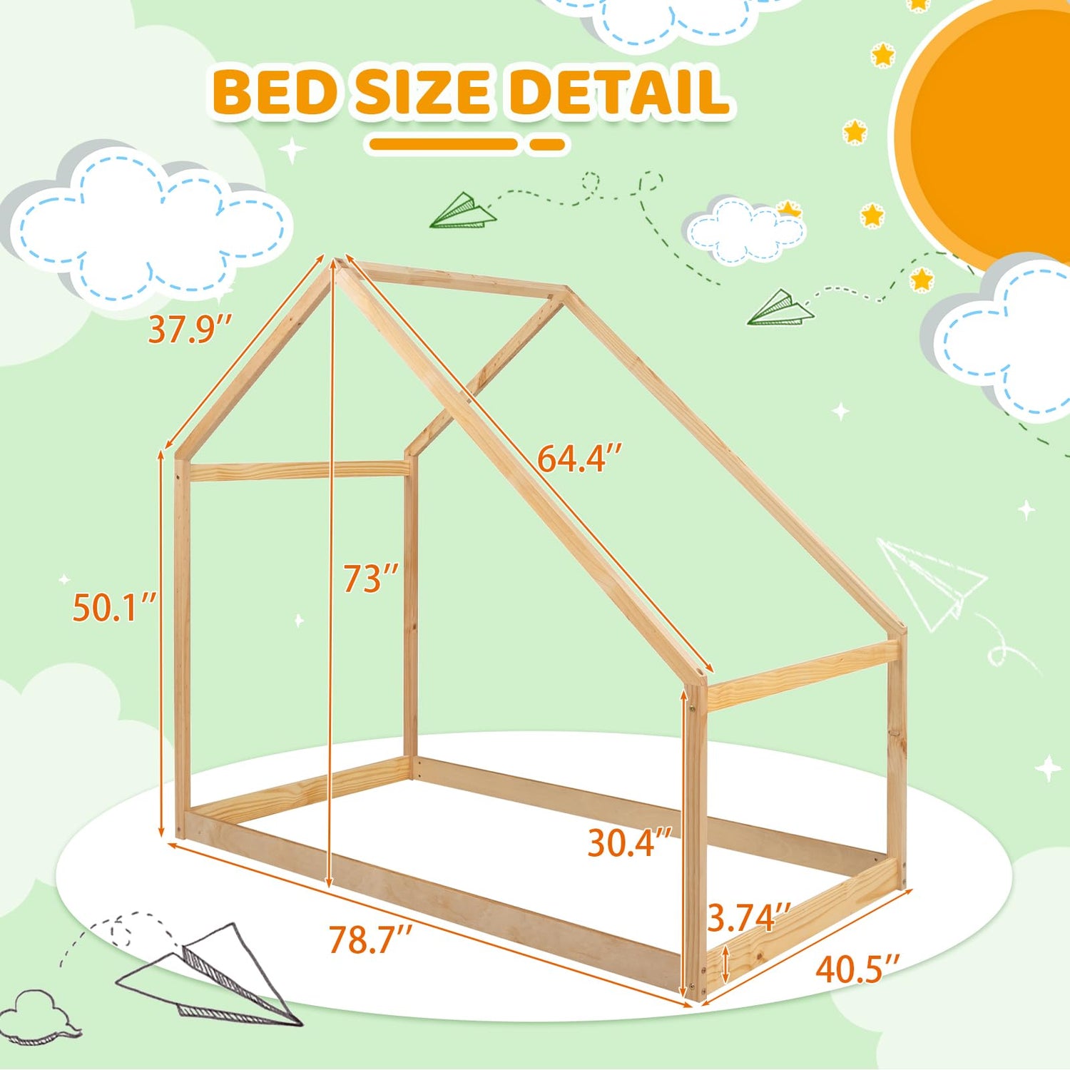 This wooden house-style bed frame boasts an overall dimension of 78.7 inches in length, 40.5 inches in width, and 73 inches in height, making it the perfect fit for a twin mattress (not included). Assembly is straightforward, allowing you to set up this delightful sleeping space with ease.