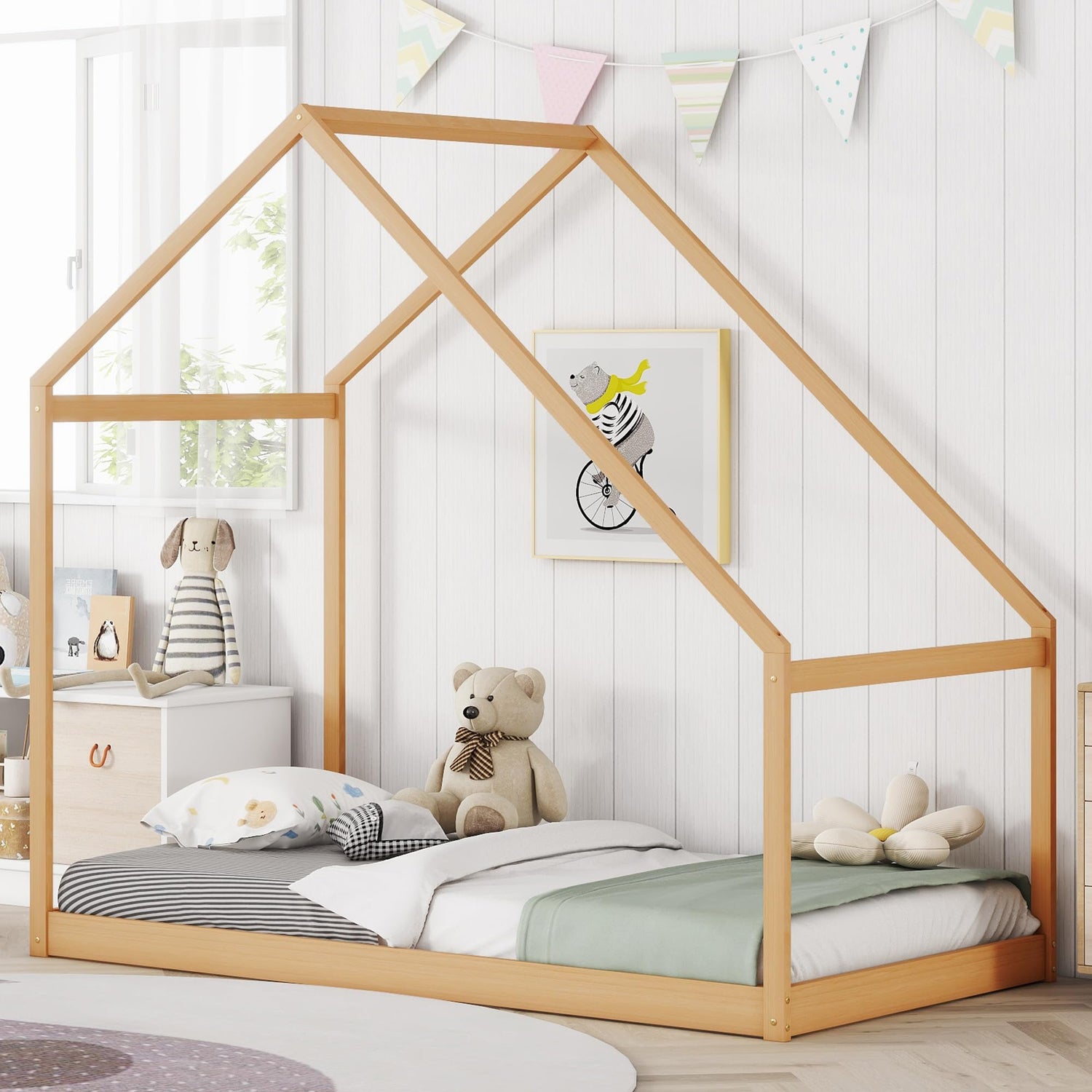 Merax Kids Twin Bed Frame with Rooftop, Montessori Wooden House Design, Sturdy and Easy to Assemble