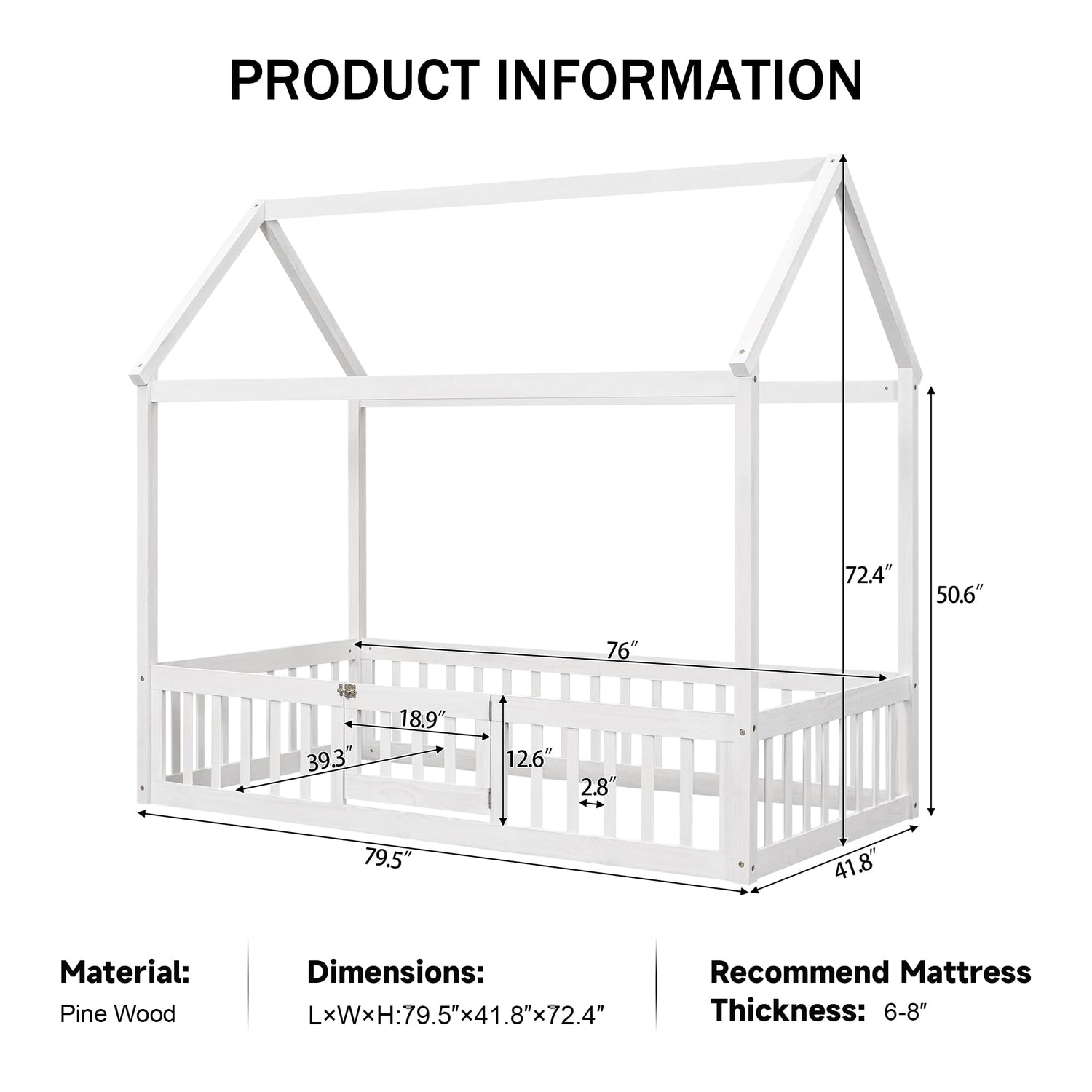 Merax Twin Size White House Bed with Fenced Design and Playful Door