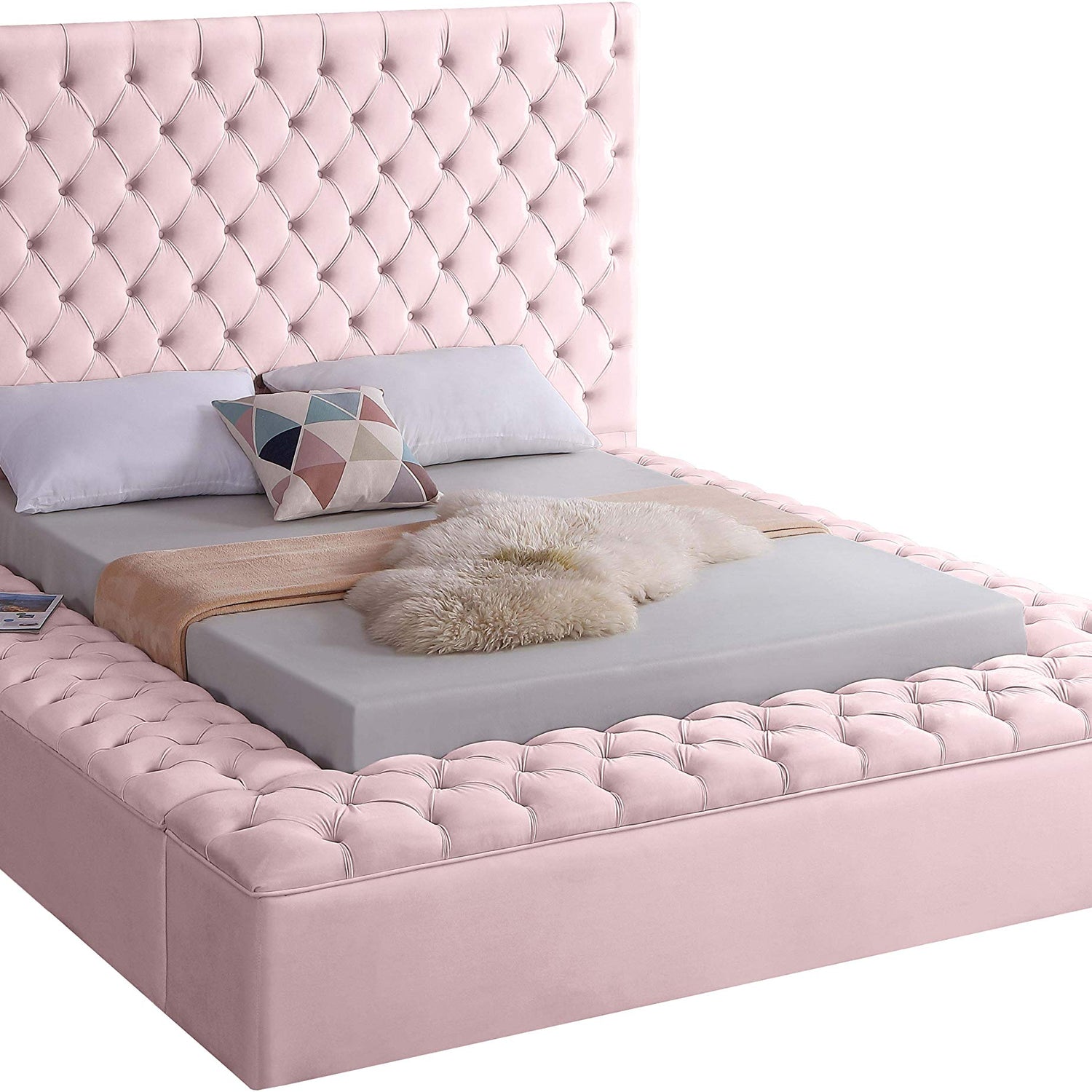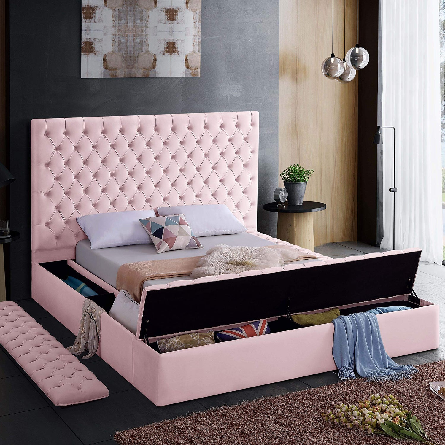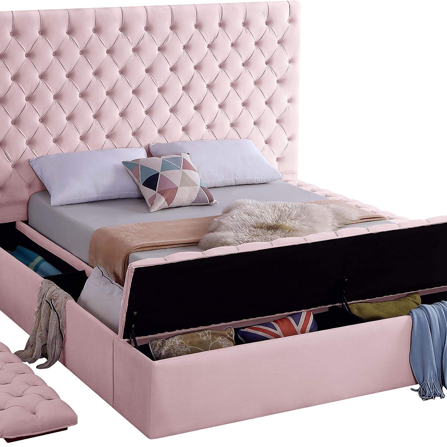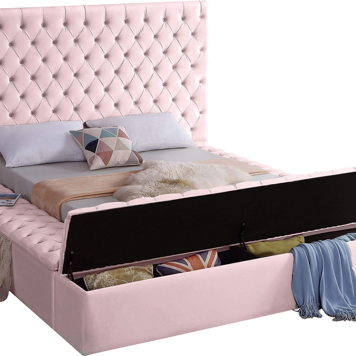 Meridian Furniture Bliss Collection Modern | Contemporary Velvet Upholstered Bed with Deep Button Tufting and Storage Compartments in Rails and Footboard, Pink, King