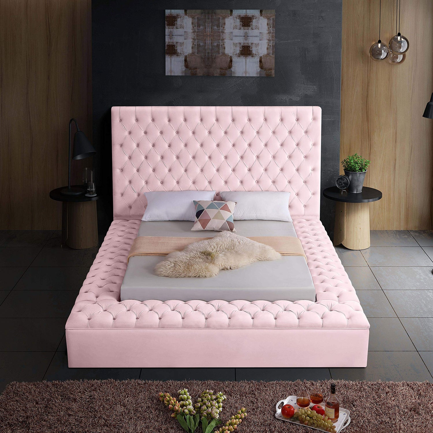 Details: Extend elegance to the bedroom with this Bliss velvet bed. This bed has a rich look, with deeply tufted upholstery along its upper platform perimeter and headboard, ensuring that it is a good fit in modern bedroom themes. Storage rails and footboard are included to ensure maximum versatility, and the bed comes with full slats, so you can use it without a box spring. The velvet fabric used in its design makes it easy to integrate alongside other furnishings.