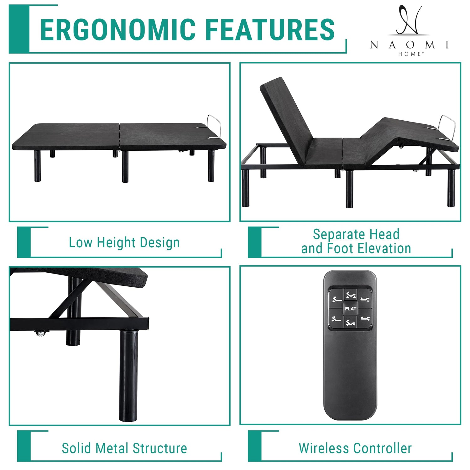 Naomi Home Serenity Split King Adjustable Bed Base, Zero Gravity, Wireless Remote, USB Ports, 800 Lb Capacity, Black Metal Frame, Easy Setup for Couples’ Comfort and Relaxation