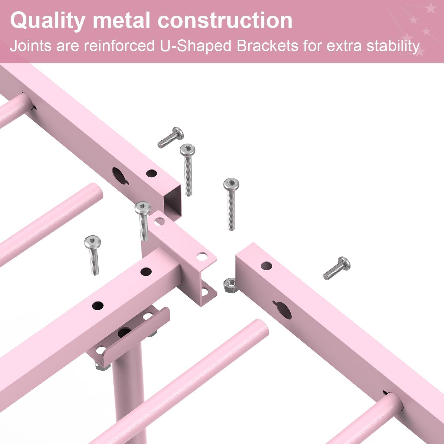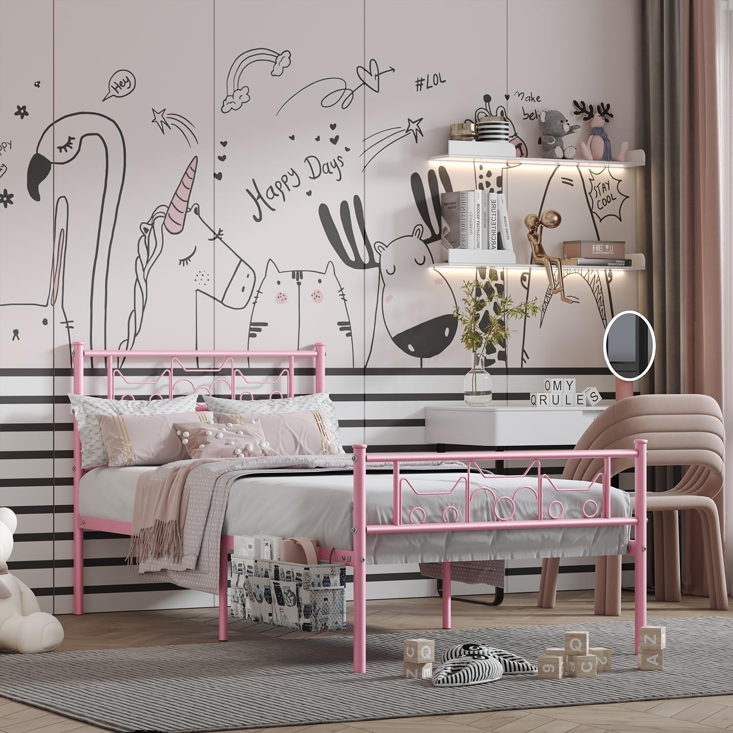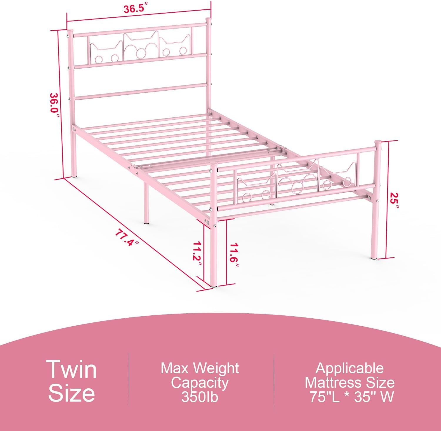 • 【Twin Size Bed Frames with Simple but Cute design】: The pattern at the head and foot of the bed is designed with 3 cute & adorable kittens. This cute design that is sure to win the hearts of all girls and k^ids. The entire bed frame is made of metal, matching the featured kittens design while being both warm and cute.