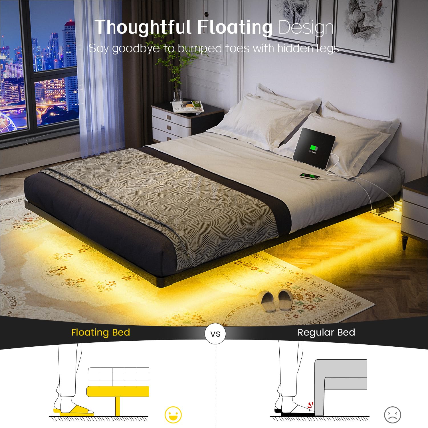 • Sleek Floating Illusion: Our innovative design creates the visual impact of a bed floating above the ground, infusing your space with a contemporary, space-saving charm that complements any full-size bedding set.